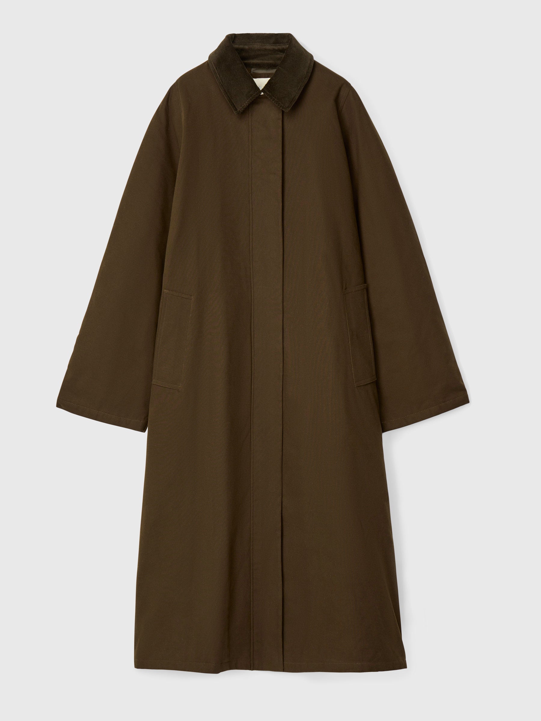 A longer take on the original, the Long Hunting Jacket follows the shape of the Anchorage Trench Coat. Made from heavyweight cotton canvas with a quilted lining, contrast corduroy collar, and raglan sleeves. Designed with comfortable patch pockets and a generous fit for layering in colder weather.