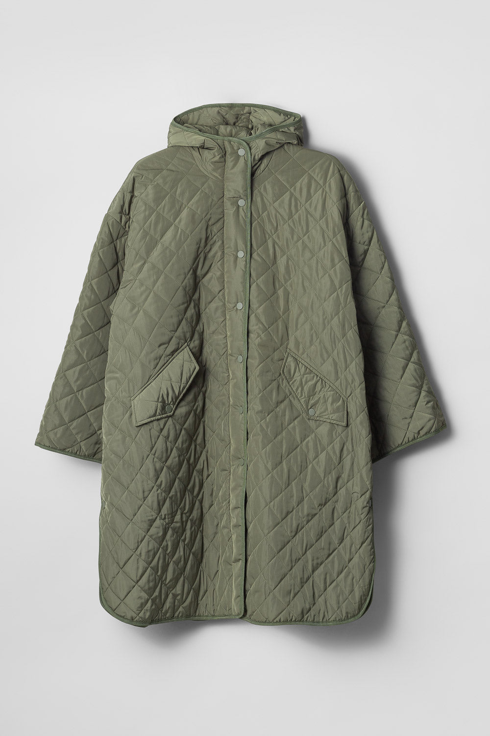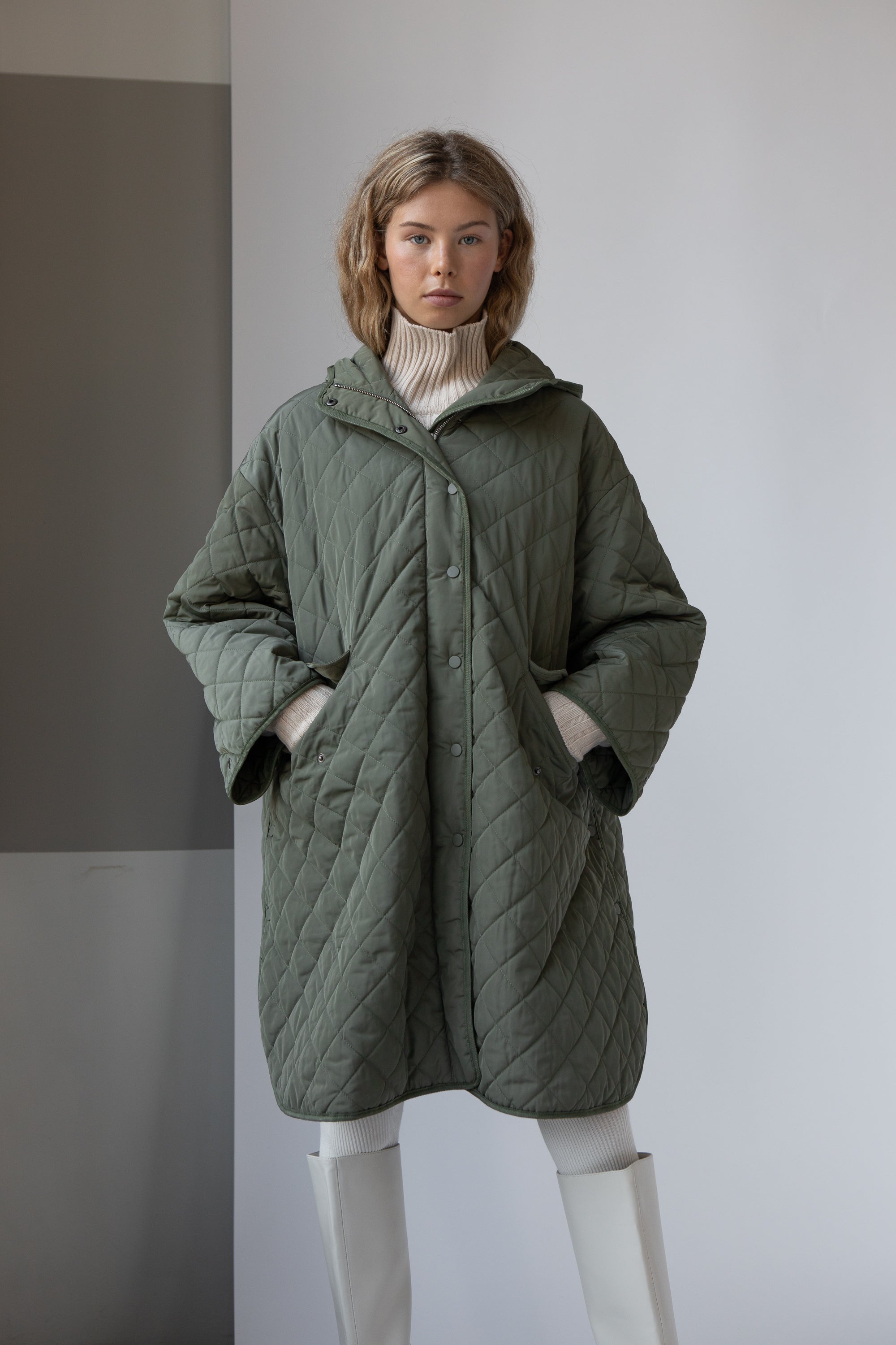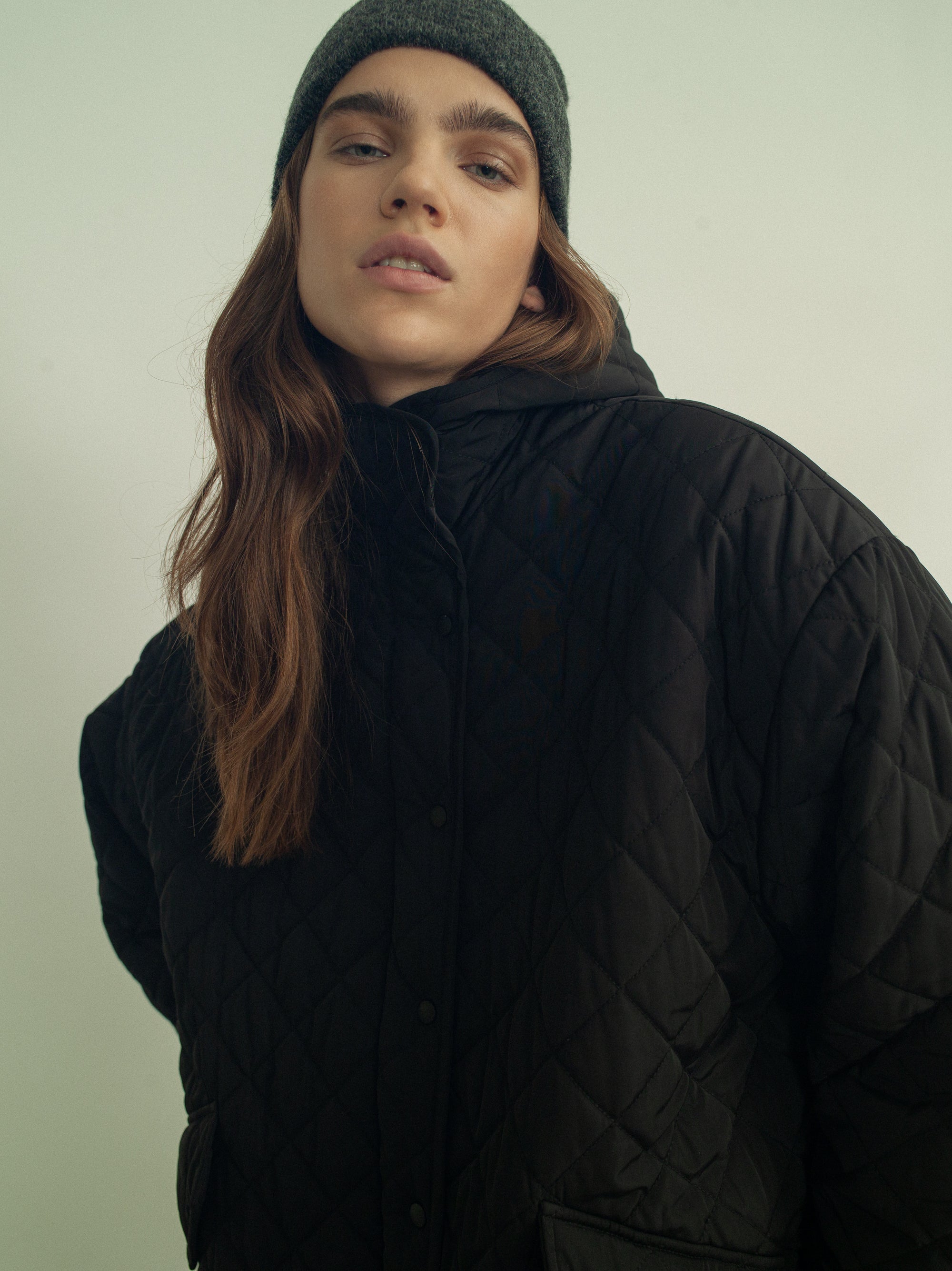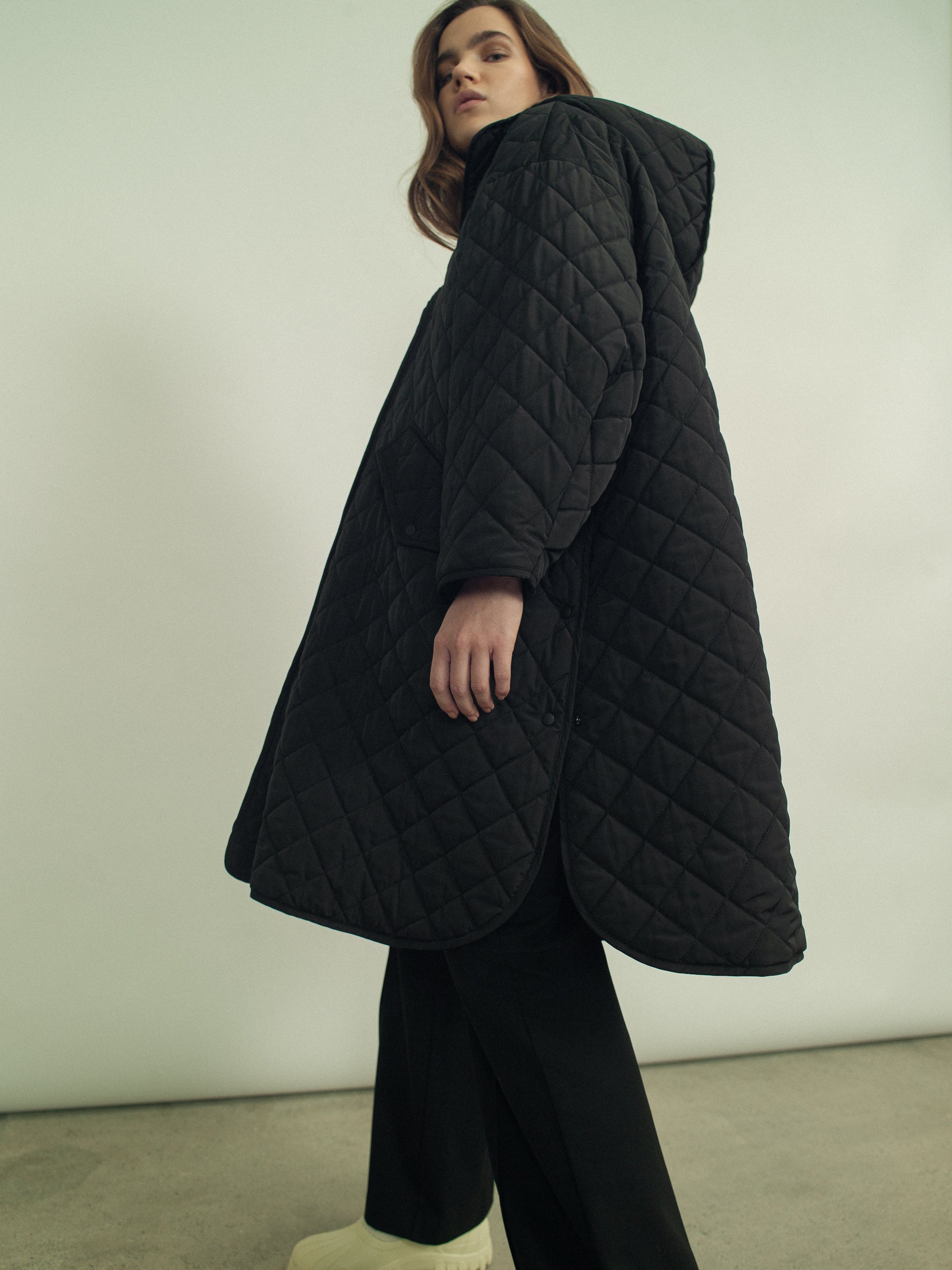 The Afterski Poncho is cut from a durable quilted tech fabric. This jacket has a transformative, over-dimensional silhouette with a generous hood, delicate seam detail at center back and practical snap buttoned slits at sides. The adjustable cuffs, functional side pockets and hidden zipper at front add to the exclusive detailing and functionality.
