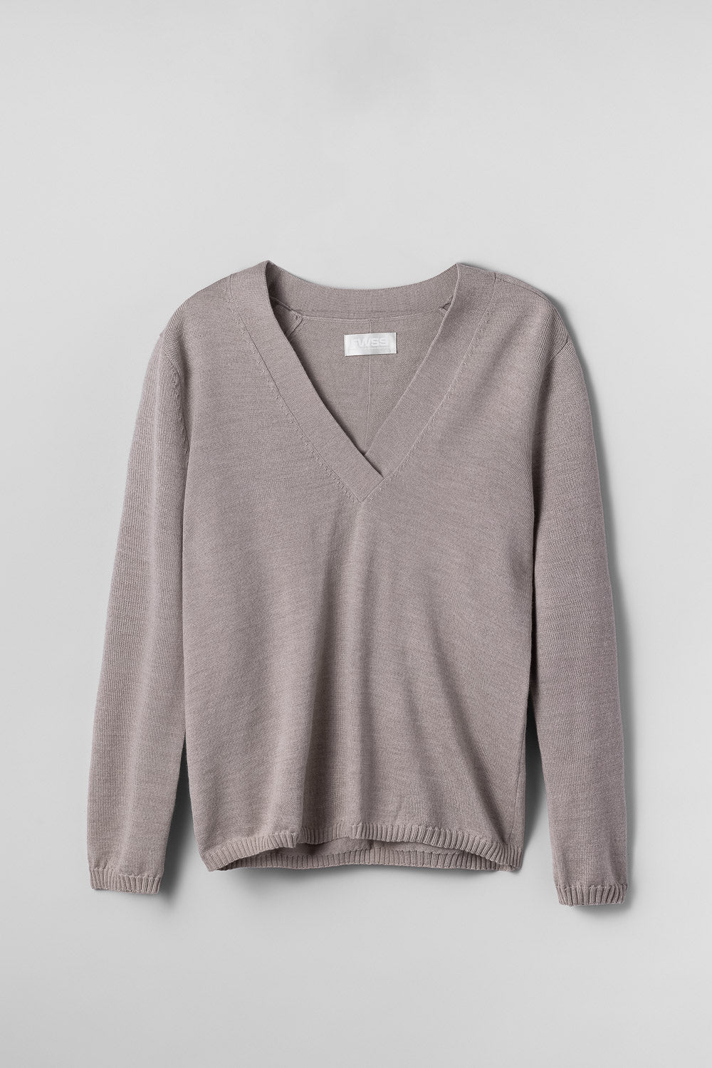The FWSS Ain´t No Mountain is long sleeved sweater made in a fine 100% merino wool yarn. It features a relaxed and loose fit with dropped shoulders and sleeves with raglan construction at back, a deep and flattering V-neck, subtle rib details on hem and cuffs, and a center back linkage seam.