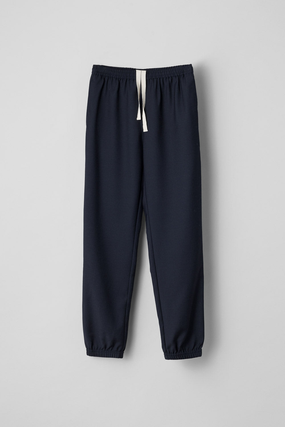 The FWSS All Walks Wool Jogger are tailored joggers cut from a hopsack weave made of 100% wool. Features pleasant details like the Italian slant pockets in the side, a welt pocket at back and elastic band at bottom. Elastic waist with hidden drawstrings ensures a comfortable fit. Both the factory making the fabric and assembling this garment runs on hydroelectric power, a renewable energy source.