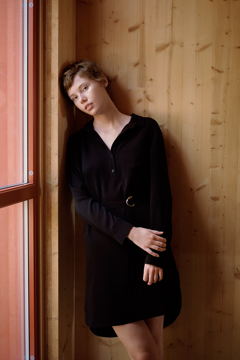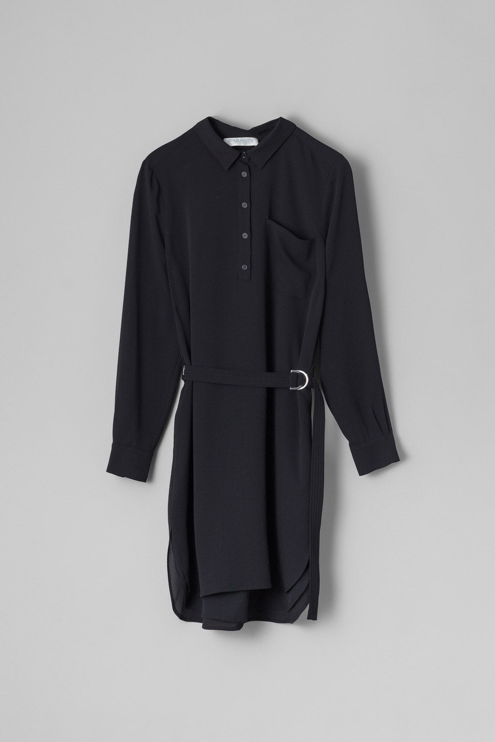 The FWSS Bennington is an above the knee long shirt dress made in 100% recycled polyester. It features a loose fit, clean collar with button stand, patch pocket at chest, side seam pockets, a rounded hem with high slits. Detachable belt follows for an optional waisted silhouette. The dress comes with lining.