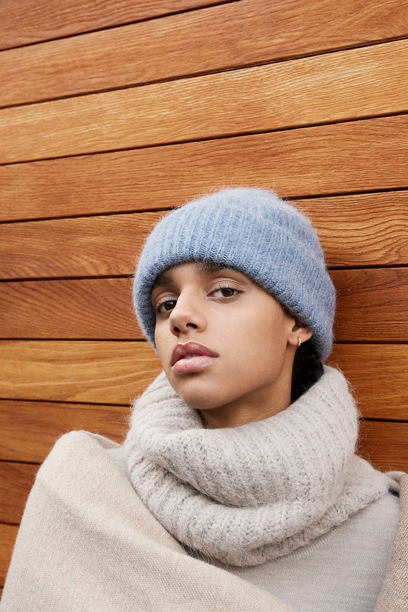 The FWSS Bordeaux Alpaca is a chunky rib knitted beanie with a high folded hem in a soft and warm alpaca mix. A warm and cozy companion during our colder seasons.