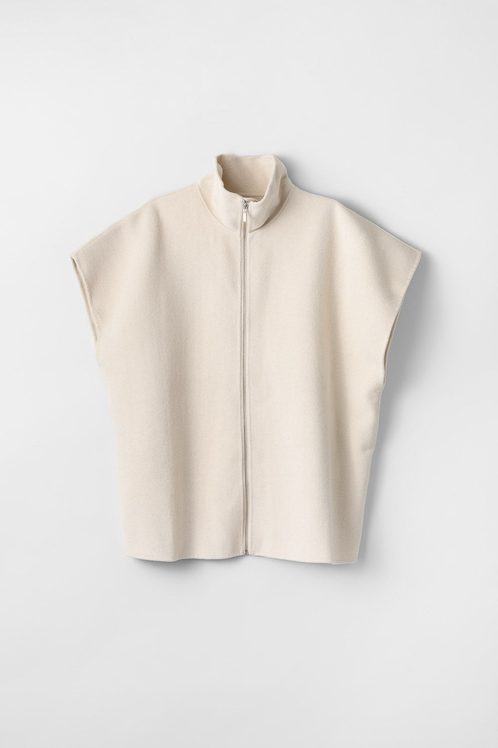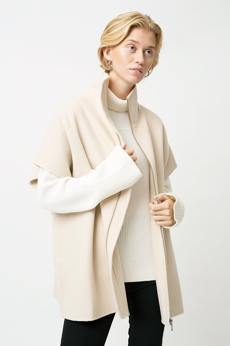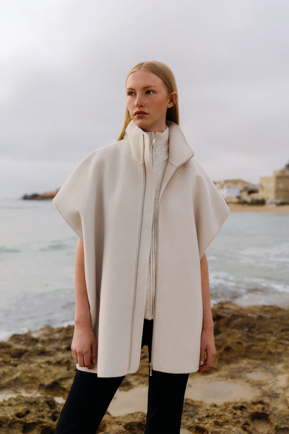 The FWSS Burner Wool Cape is a sleeveless cape cut from a soft and brushed fine 100% wool quality. Hand stitched and beautifully crafted, the piece has exquisite finishing. Features a high neck, YKK metal zipper in front and a subtle center back seam. The cape has a loose fit and the quality drapes nicely, making the cape a perfect layering piece for when the warm days cool down to chill summer nights.