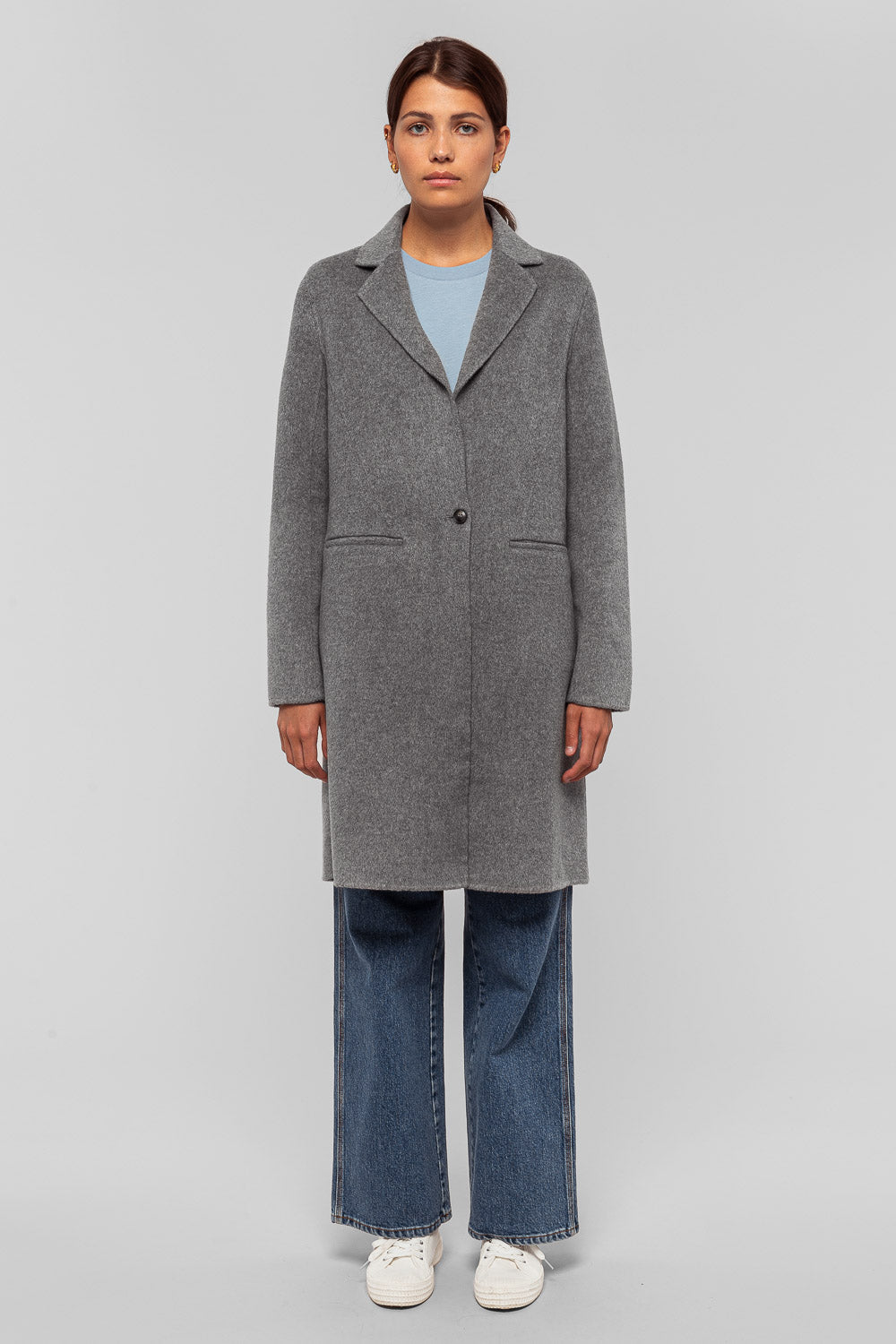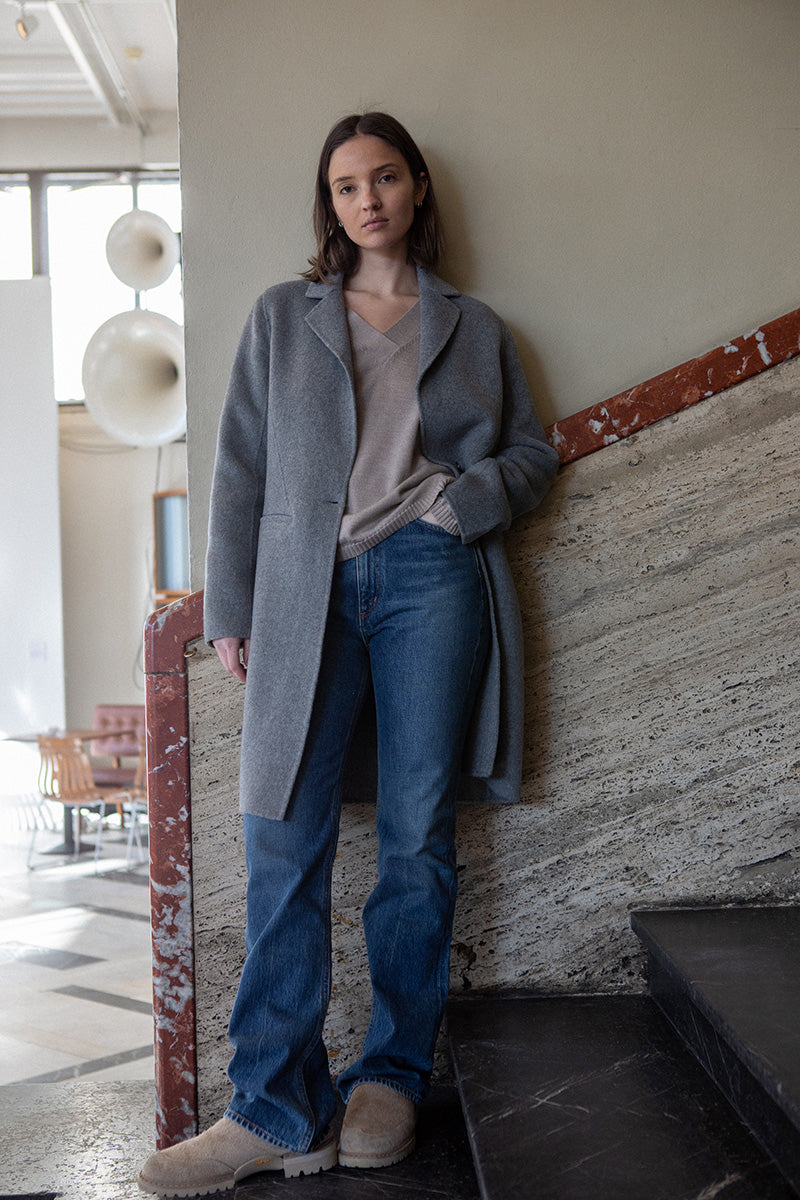 The FWSS Cementality is a sophisticated coat with a slightly loose silhouette, crafted from 100% fine wool. The wool coat mirrors the lines of a classic blazer with its relaxed shawl collar, practical slant pockets and delicate back vent for easy movement. Perfect to layer over everything from chunky knits to jeans or dresses.