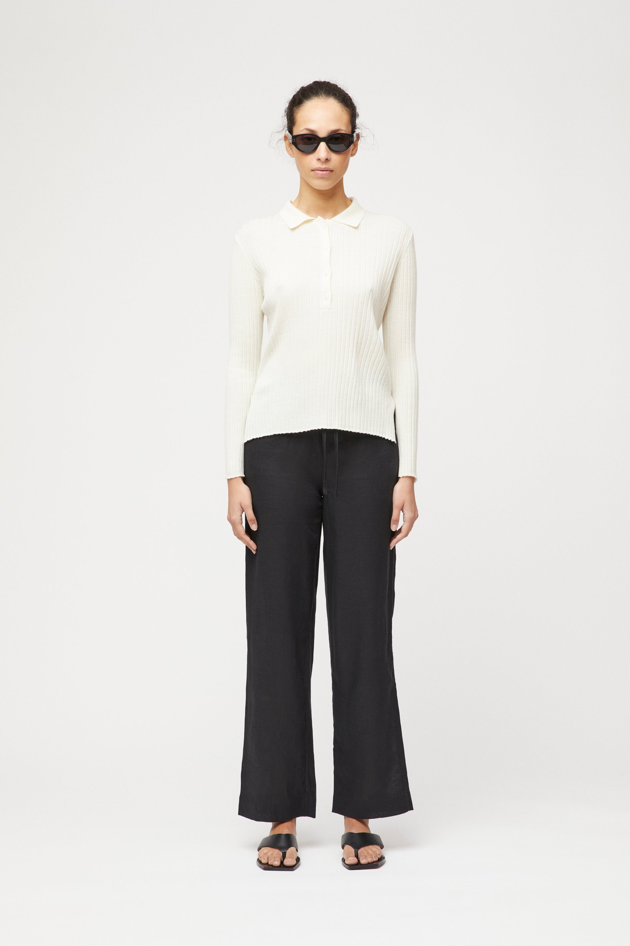 The FWSS Colette Piqué is crafted from super soft merino wool. This sophisticated style is knitted in a fitted piqué design that offers a snug and flattering silhouette. The classic collar with button-down placket adds preppiness and elegance, elevating the shirt's overall appeal. Delicate slit details at the side seam and long cuffs add subtle yet distinctive accents, enhancing the shirt's refinement. Style with the FWSS Linen Côte d’Azur Midi Skirt for a refined look.