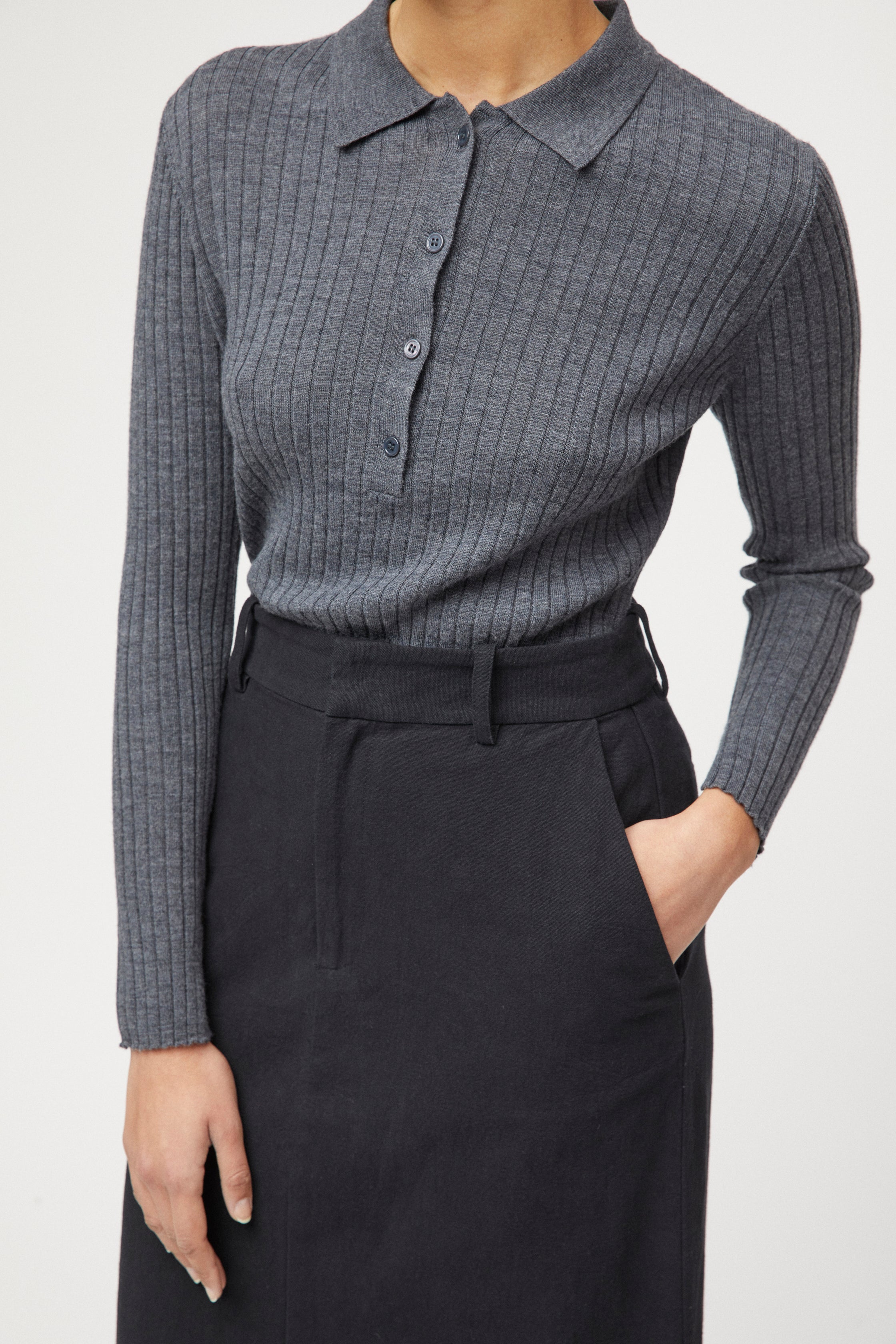 The FWSS Colette Piqué is crafted from super soft merino wool. This sophisticated style is knitted in a fitted piqué design that offers a snug and flattering silhouette. The classic collar with button-down placket adds preppiness and elegance, elevating the shirt's overall appeal. Delicate slit details at the side seam and long cuffs add subtle yet distinctive accents, enhancing the shirt's refinement. Style with the FWSS Linen Côte d’Azur Midi Skirt for a refined look.