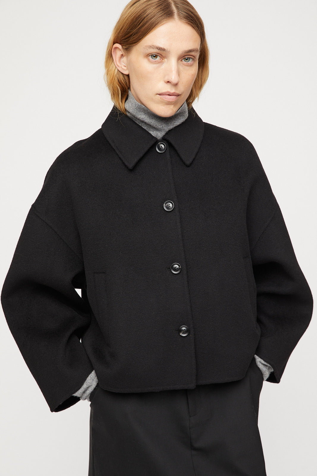 The FWSS Cropped Doublé Jacket is crafted from 100% doublé wool, providing protection from the elements, in addition to a luxurious and warm feel. The dense wool fabric ensures you stay cozy while looking stylish. Designed with a slightly cropped body and long cocoon-shaped sleeves, this jacket features a button-down front and a preppy collar, adding an elevated touch to the classic silhouette. For an effortlessly chic look, style with FWSS Relaxed Wide Leg Jeans and Classic Cashmere Cardigan.