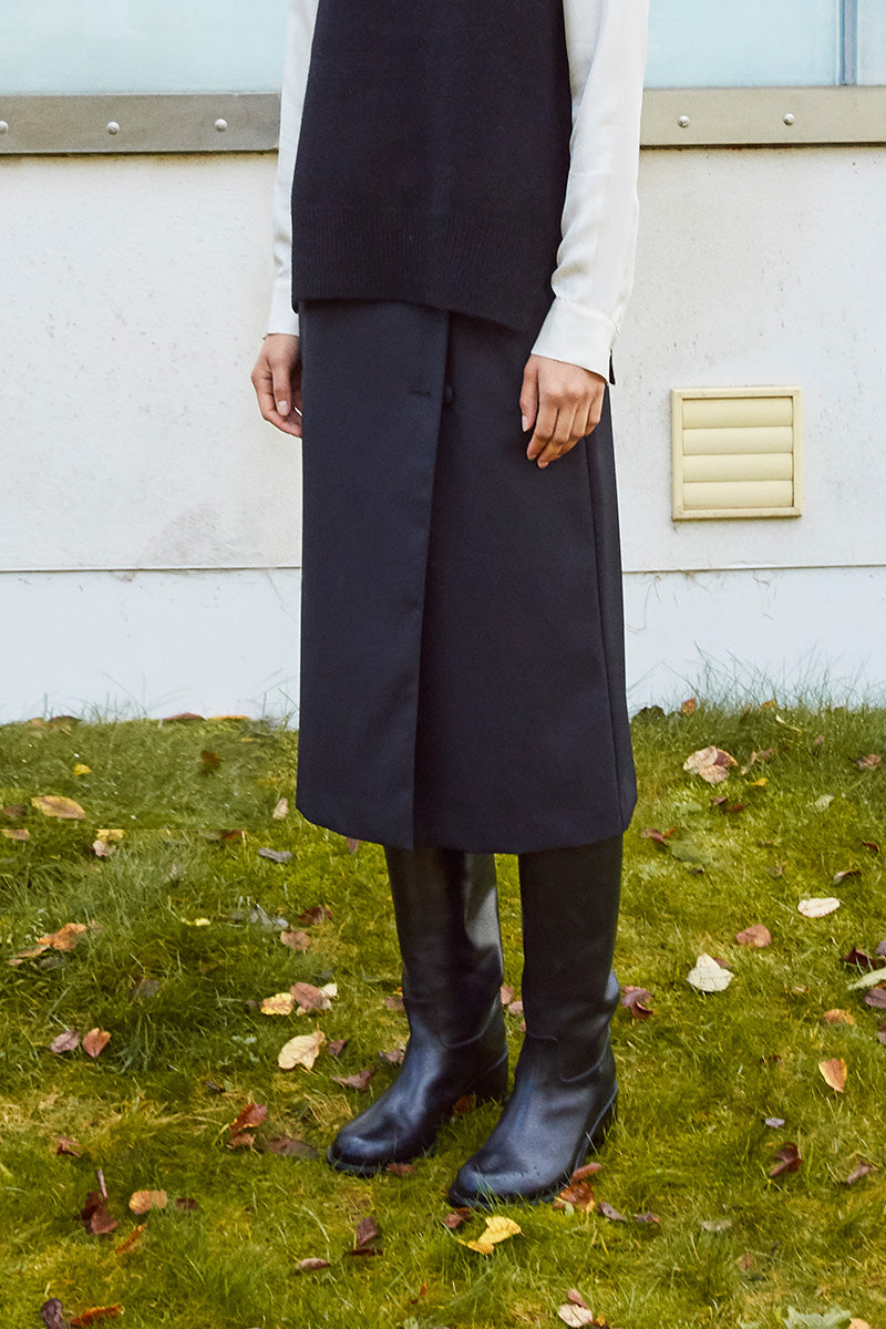 The FWSS Dancing Queen Wrap Skirt is a midi length wrap skirt. Tailored in a fine wool mix that is naturally crease resistant, the skirt features Italian slant pockets in side seam, genuine wrap closing at front and self-covered buttons. The perfect skirt you can dress up as well as down, making the transition from work-to-play effortless.