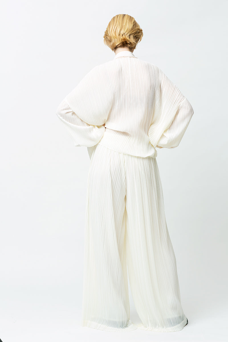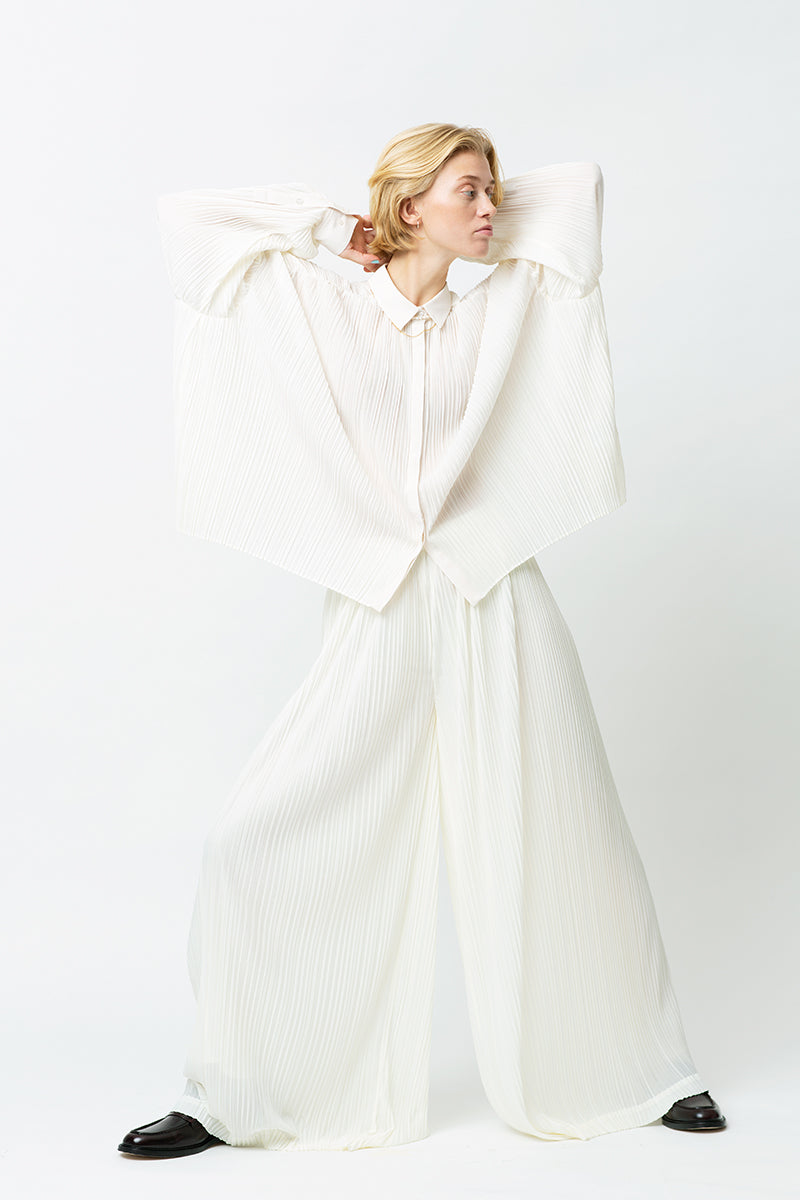 The FWSS Ewa are full length, wide leg trousers cut from a lustrous and soft pleat fabric. The quality makes it drape beautifully with an airy and floating silhouette. Features an elastic waist and the trousers come lined. Wear it with our Kristi shirt or Hong Kong Garden Pleat top for a dreamy matching set.