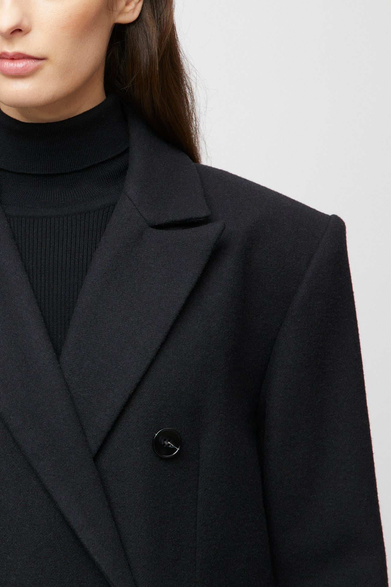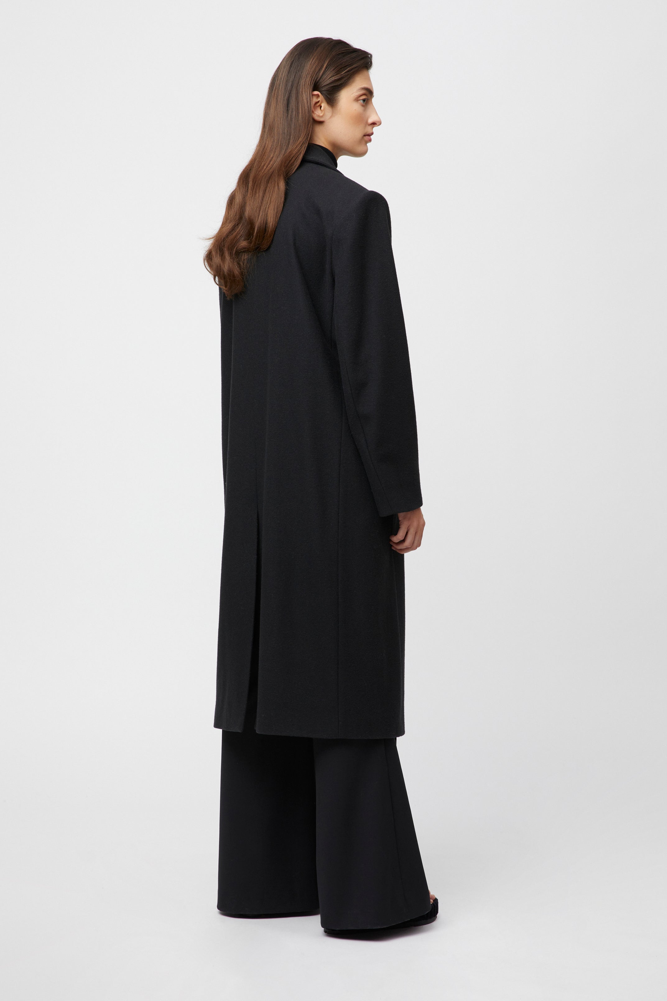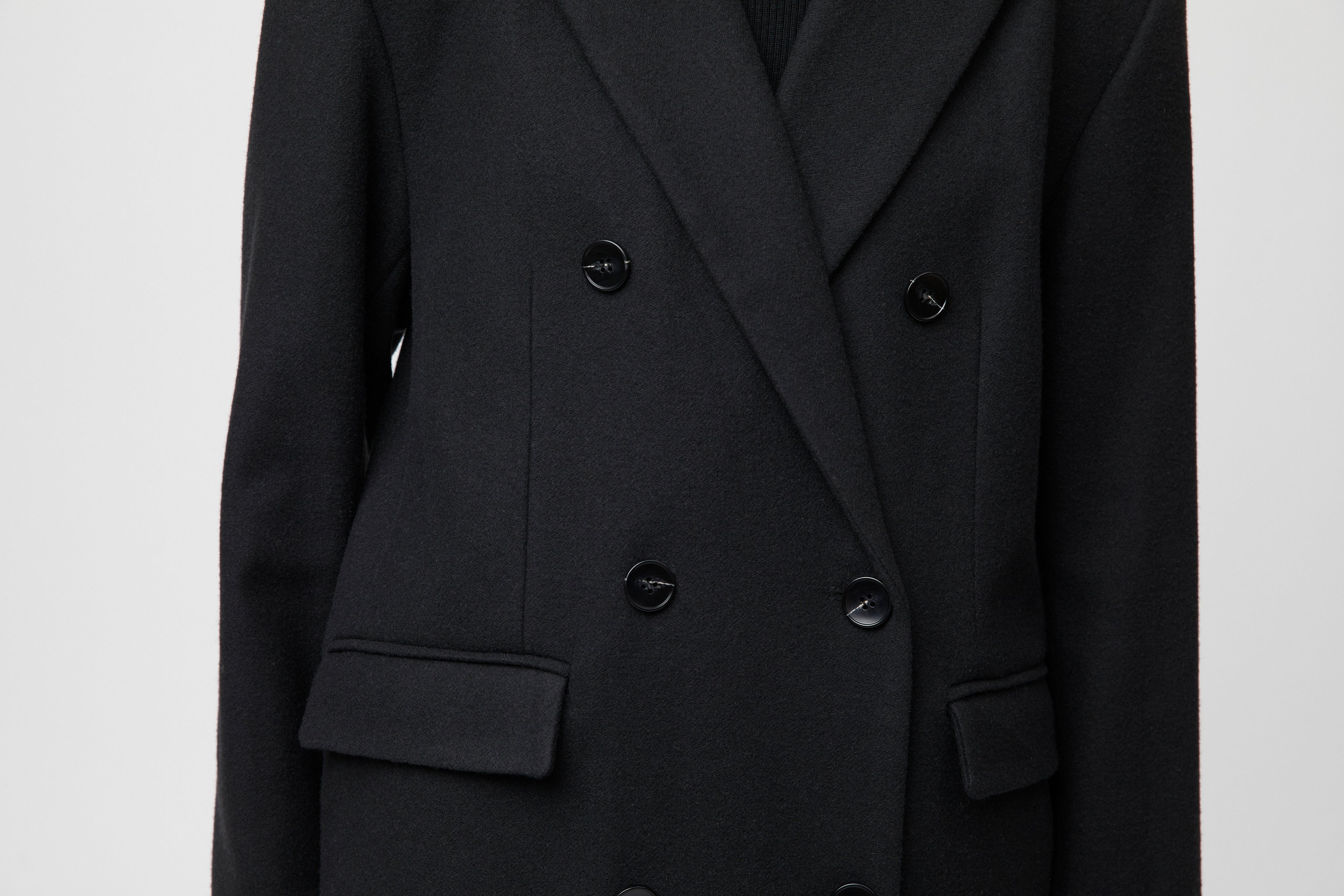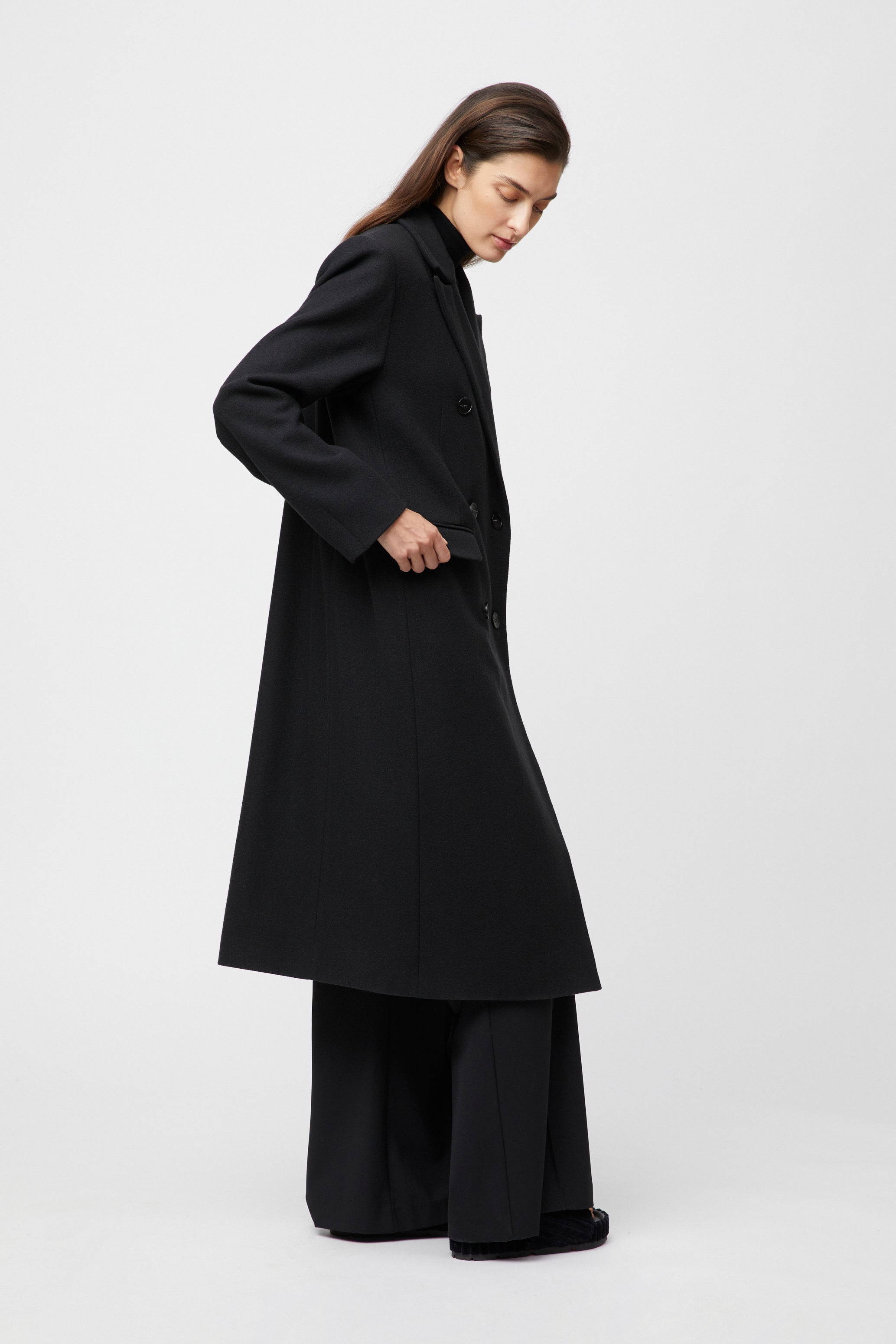 The FWSS Florence Overcoat is a double-breasted coat crafted from a soft yet sturdy wool fabric. The silhouette references the classic 90’s in its neat, oversized boyfriend fit with structured, padded shoulders and a sharp collar. The flap pockets at the front panel and slit at the center back provide viability and function. The smooth lining ensures a comfortable fit and easy layering. This elegant wool coat is the essence of warmth and style that provides a cozy embrace while making a fashion statement. The timeless black color adds versatility, allowing you to effortlessly pair it with any outfit. With its exquisite craftsmanship and attention to detail, the FWSS Florence Overcoat is a must-have for those chilly days when you want to stay both chic and snug.