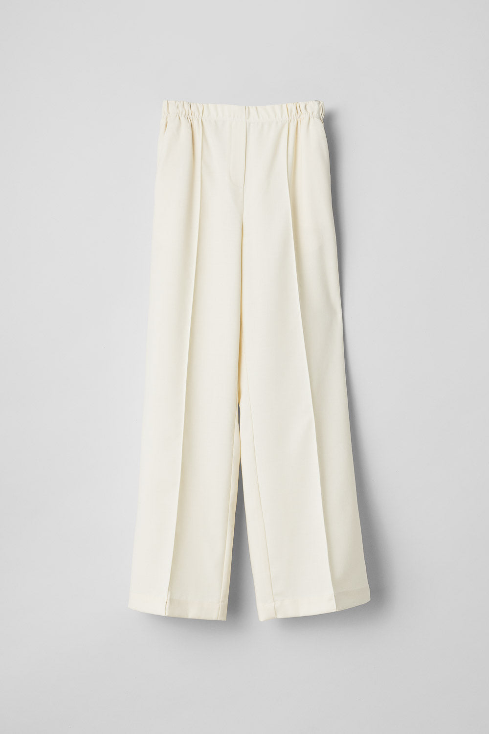The FWSS Fool Wool Trousers are comfortable yet elegant trousers cut from a hopsack weave made of 100% wool. Features tailoring details such as the pressed creases with top stitches at front, Italian slant pockets in the side, a passepoil pocket at back. Elastic waist ensures a comfortable fit. Trousers are easy to style up as well as down, making the transition from work-to-play effortless. The trousers in color Papyrus comes lined. Both the factory making the fabric and assembling this garment runs on hydro electric power, a renewable energy source.