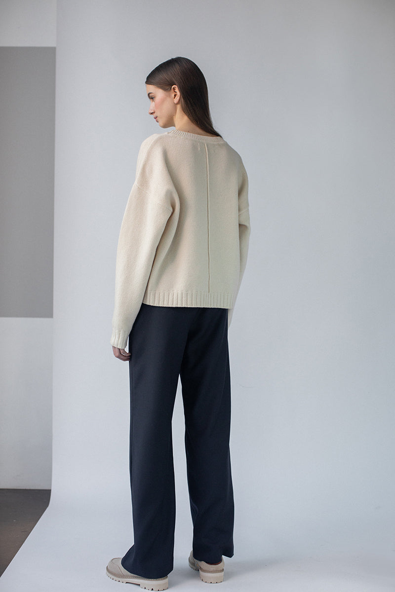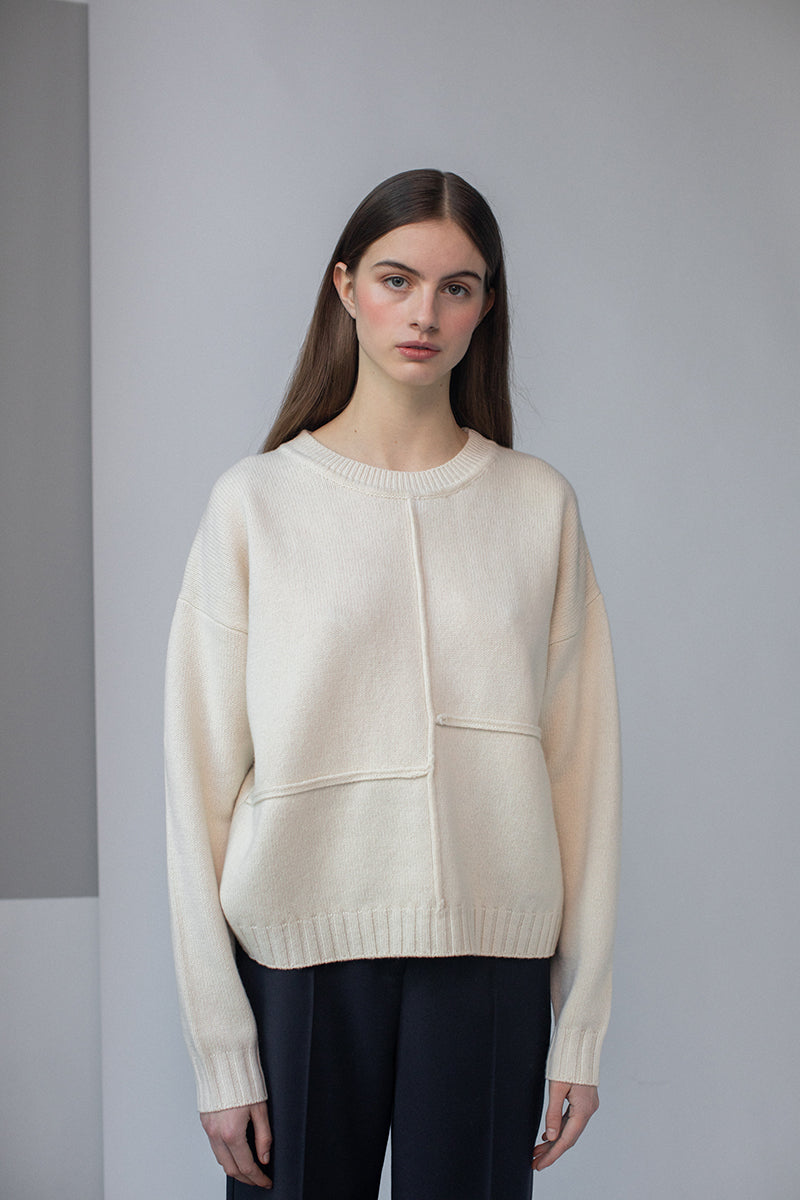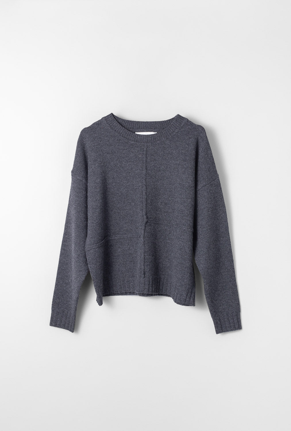 The FWSS Grey Lines Jumper is knitted from 100% soft wool. The delicate boxy knit is designed with asymmetrical lines in front and in the back. It has a subtle round neckline with wide rib hems. Style it with the cool FWSS Patterns pants and you are all set!