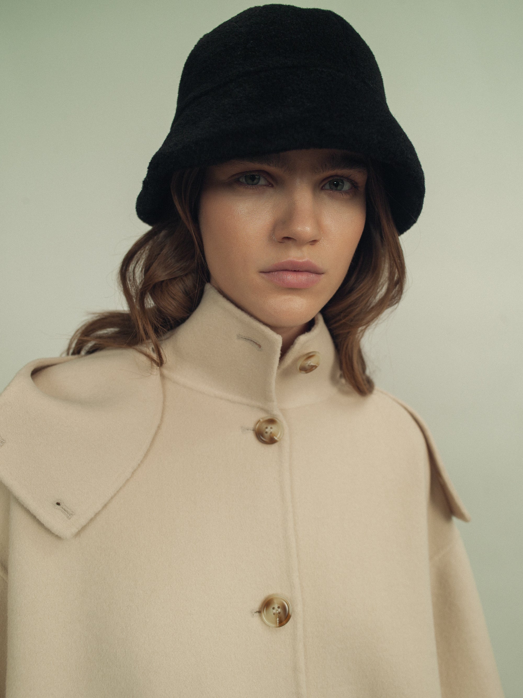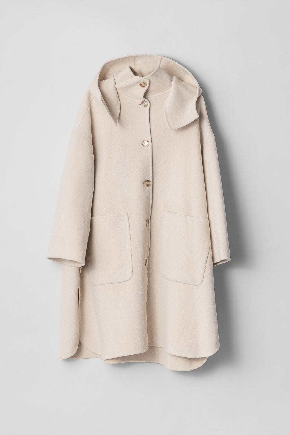 The FWSS Holiday Coat is cut from luxurious wool doublé– a double layered woven wool fabric with a density to protect against the elements. The coat has a luxurious, seamless drape with beautiful detailing like the detachable hood and buttoned side slits. Featuring a button up funnel neck closure and two generous pockets that will keep your hands warm in the cold.