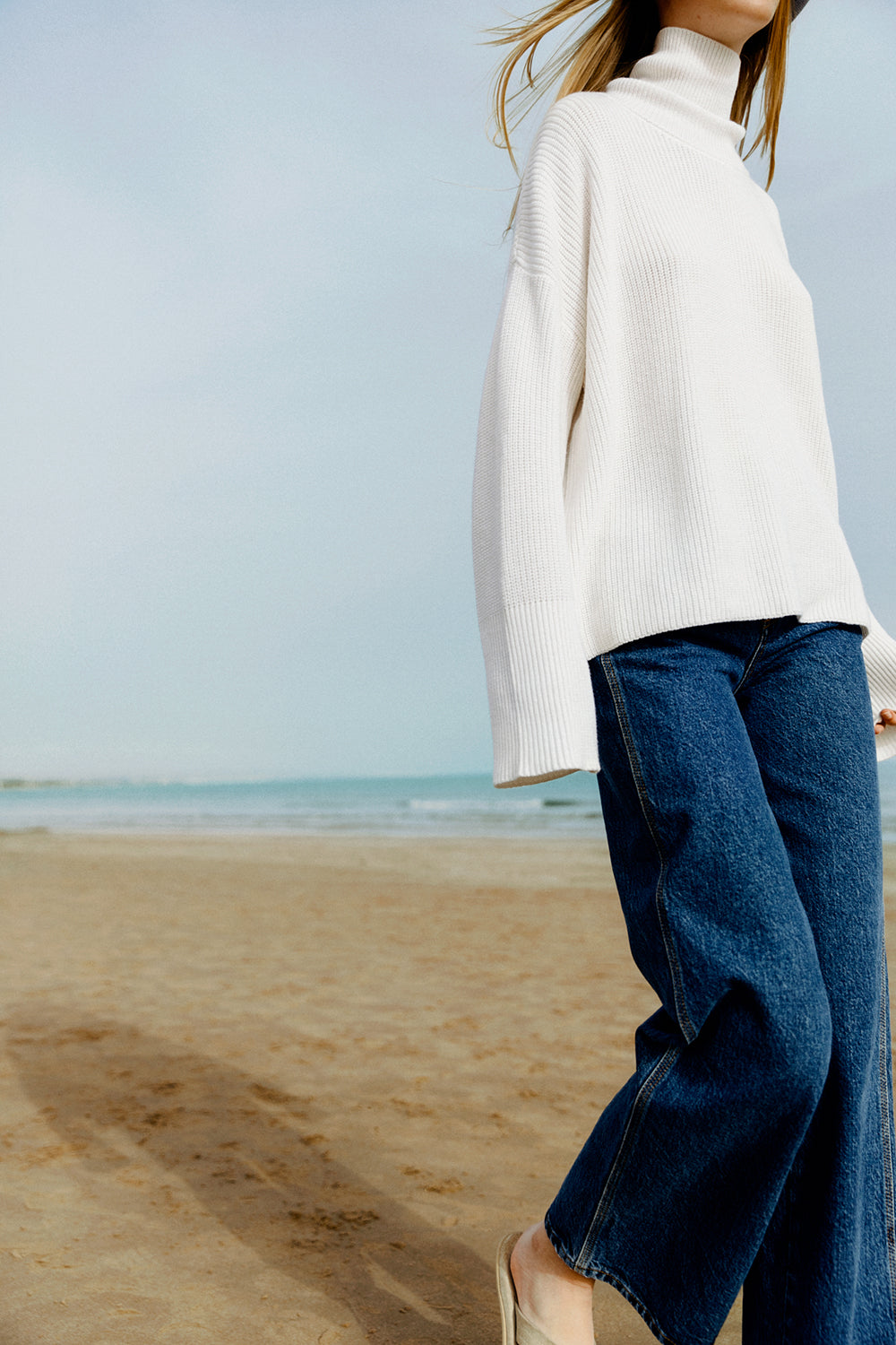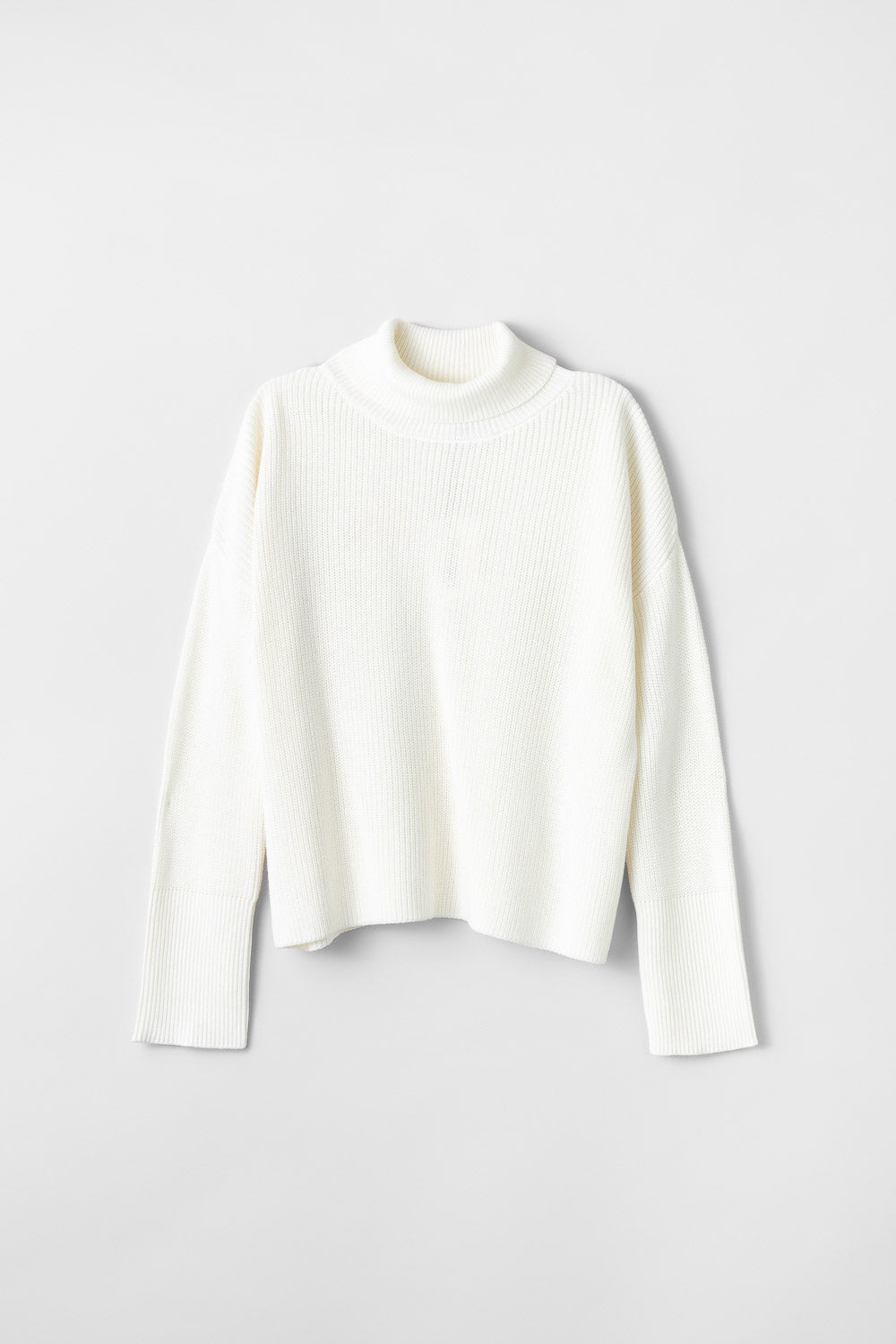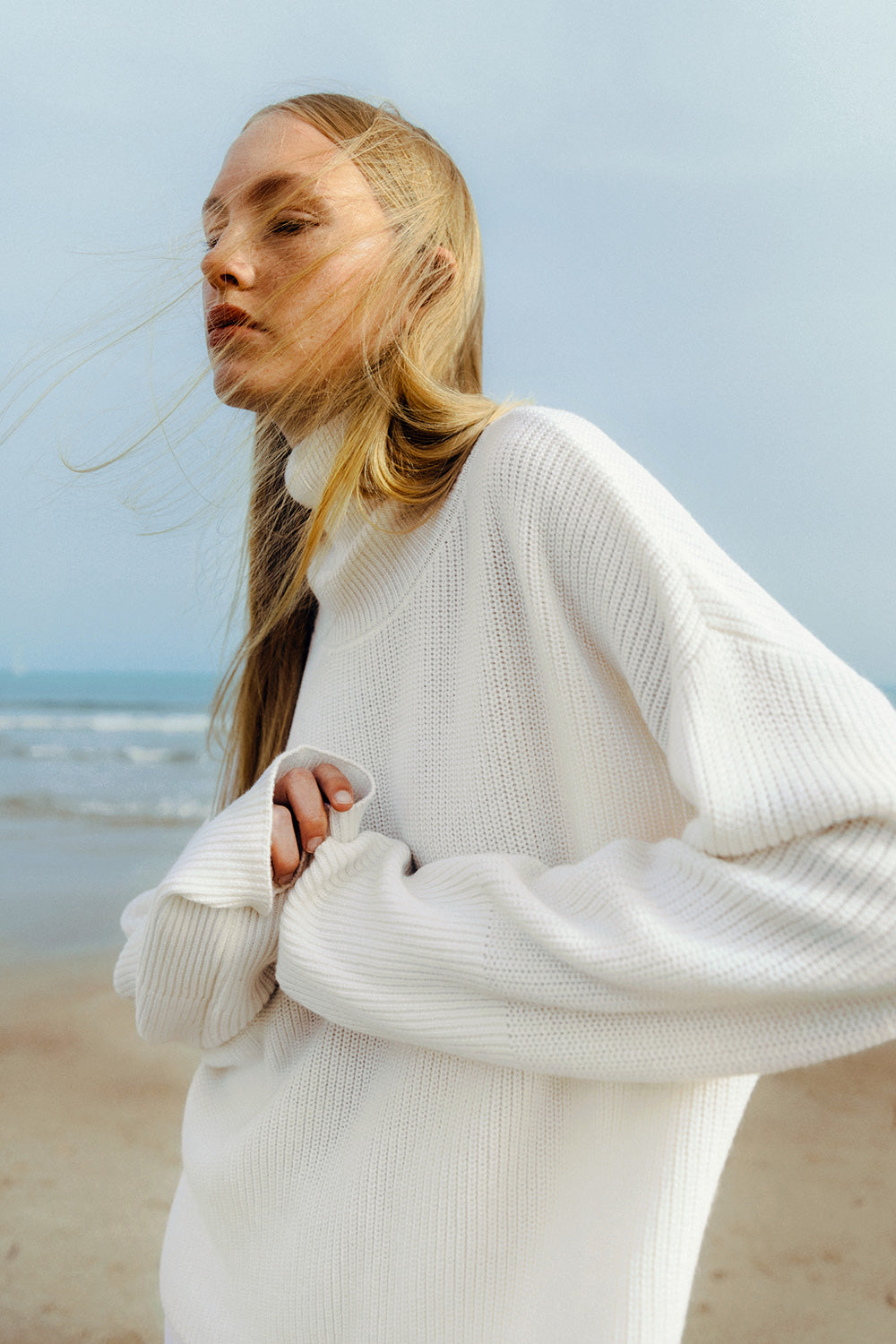 The FWSS Julie Cotton Rib is a long sleeved jumper knitted from a merino and cotton mix yarn. Cotton fibres, soft and with a subtle dryness intertwined with the warmth and smoothness of the fine merino wool fibres makes for a super comfortable quality perfect for the summer. The style features an oversized and relaxed fit, ribbed turtleneck and cuffs and a full cardigan knit stitch that makes the sweater rest nicely and comfortably on the body.