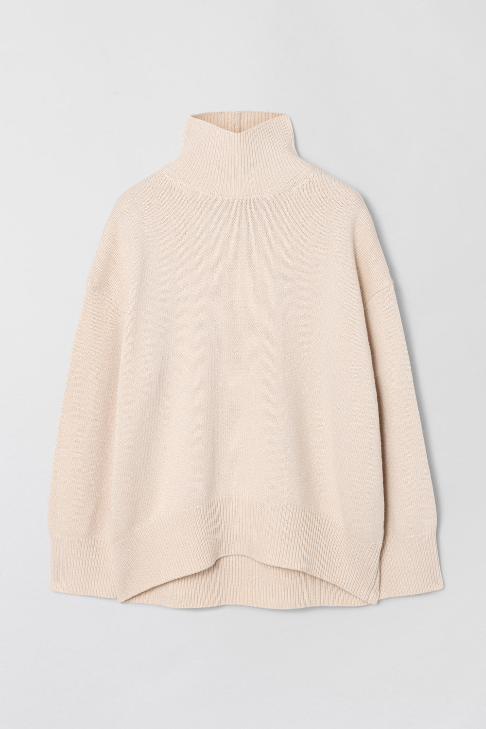 The FWSS Juliette Sweater is knitted in 100% extrafine merino wool with a brushed finish, offering both softness and warmth. This sweater features an oversized, cocoon-shaped fit with dropped shoulders, complemented by fully fashioned knit detailing around the armholes and neckline, and delicately ribbed turtleneck, hem, and cuffs. Designed for the woman who wants to feel comfortable while looking elegant, the Juliette Sweater combines luxurious material with a chic silhouette. The curved front and back hemline add a subtle touch of elegance to this cozy piece. Style with the FWSS Stretch Zip Leggings and loafers for an effortless outfit.