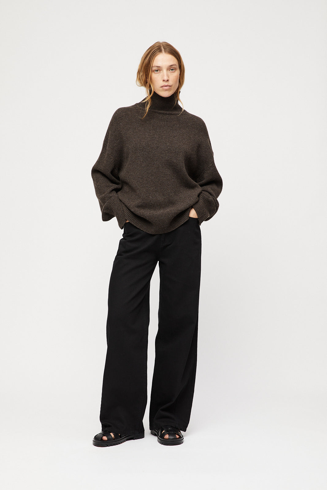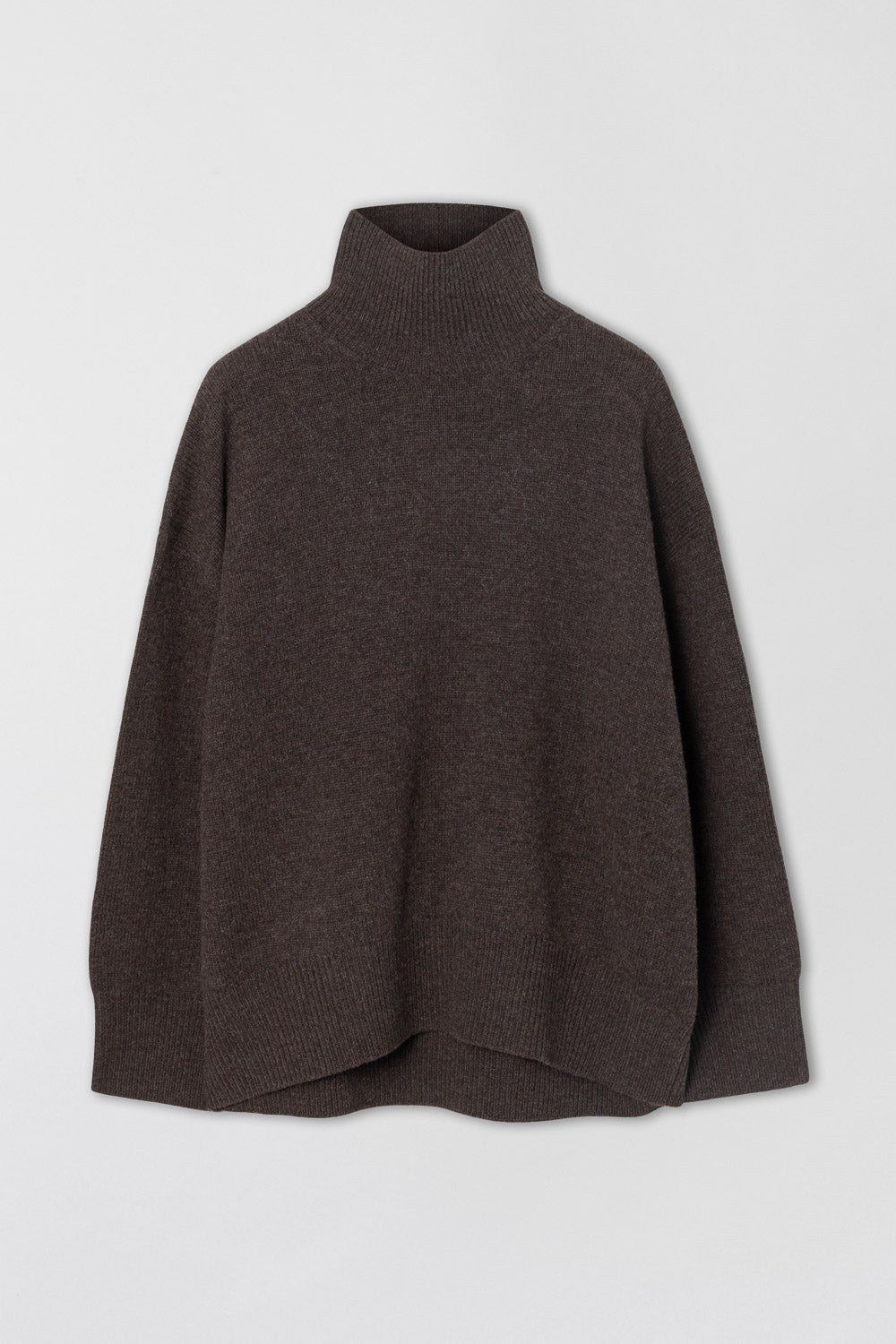 The FWSS Juliette Sweater is knitted in 100% extrafine merino wool with a brushed finish, offering both softness and warmth. This sweater features an oversized, cocoon-shaped fit with dropped shoulders, complemented by fully fashioned knit detailing around the armholes and neckline, and delicately ribbed turtleneck, hem, and cuffs. Designed for the woman who wants to feel comfortable while looking elegant, the Juliette Sweater combines luxurious material with a chic silhouette. The curved front and back hemline add a subtle touch of elegance to this cozy piece. Style with the FWSS Stretch Zip Leggings and loafers for an effortless outfit.