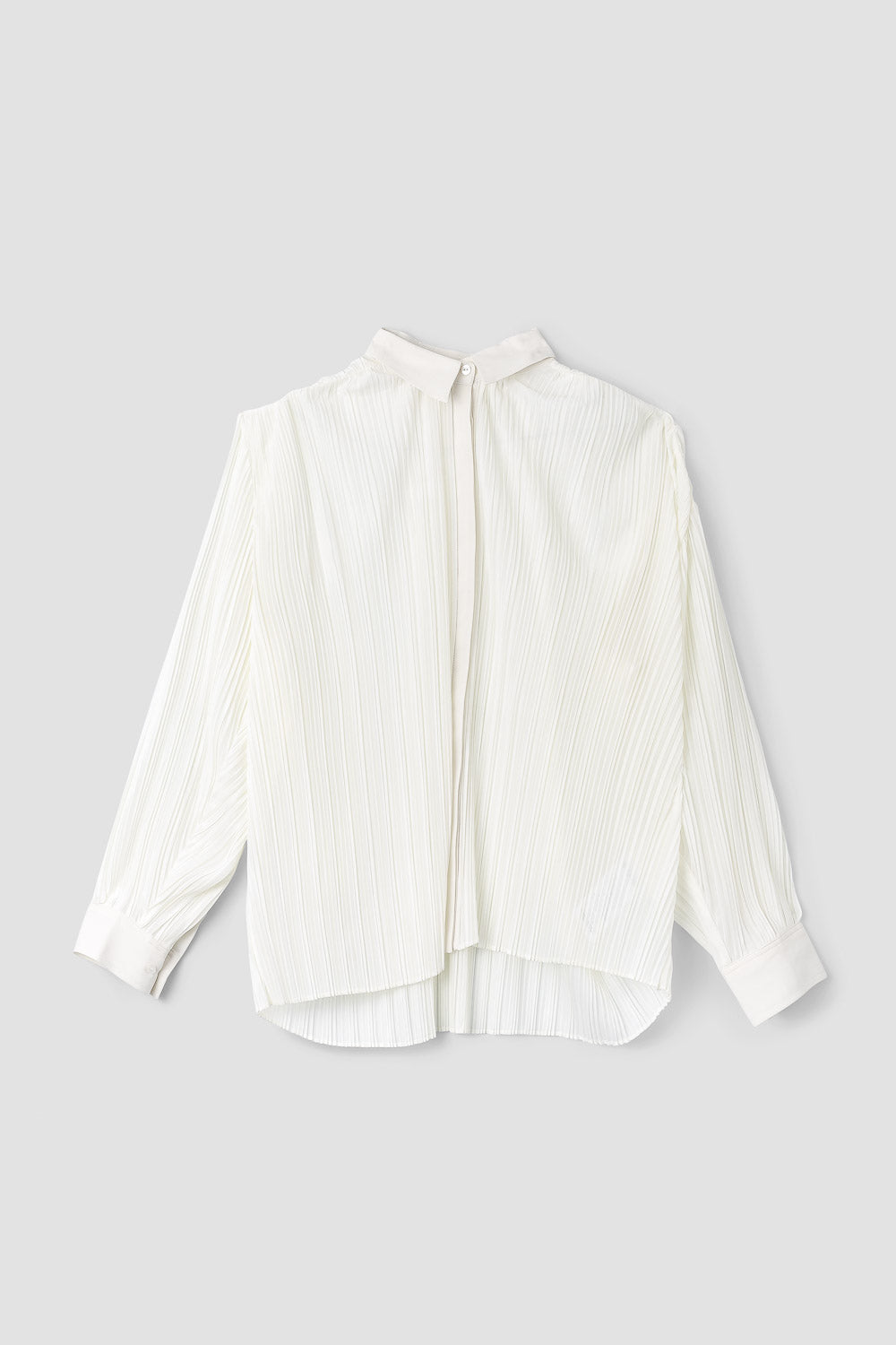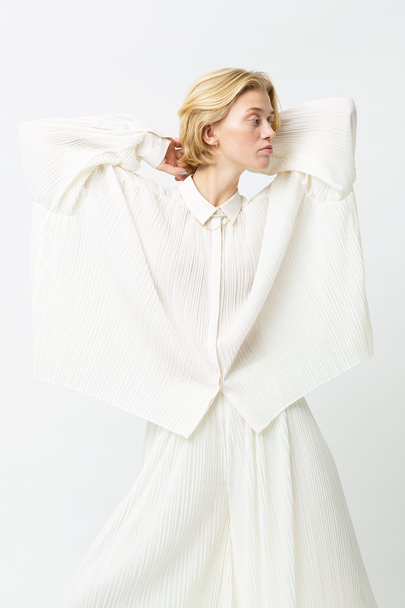 The FWSS Kristi is a long sleeved shirt cut from a lustrous and soft pleat fabric. It has a loose and relaxed fit, features details in contrasting 100% silk fabric such as the collar, cuffs and button stand. The quality makes it drape beautifully with an airy and floating silhouette. Wear it with our Ewa trouser or Tao Pleat skirt for a dreamy matching set.