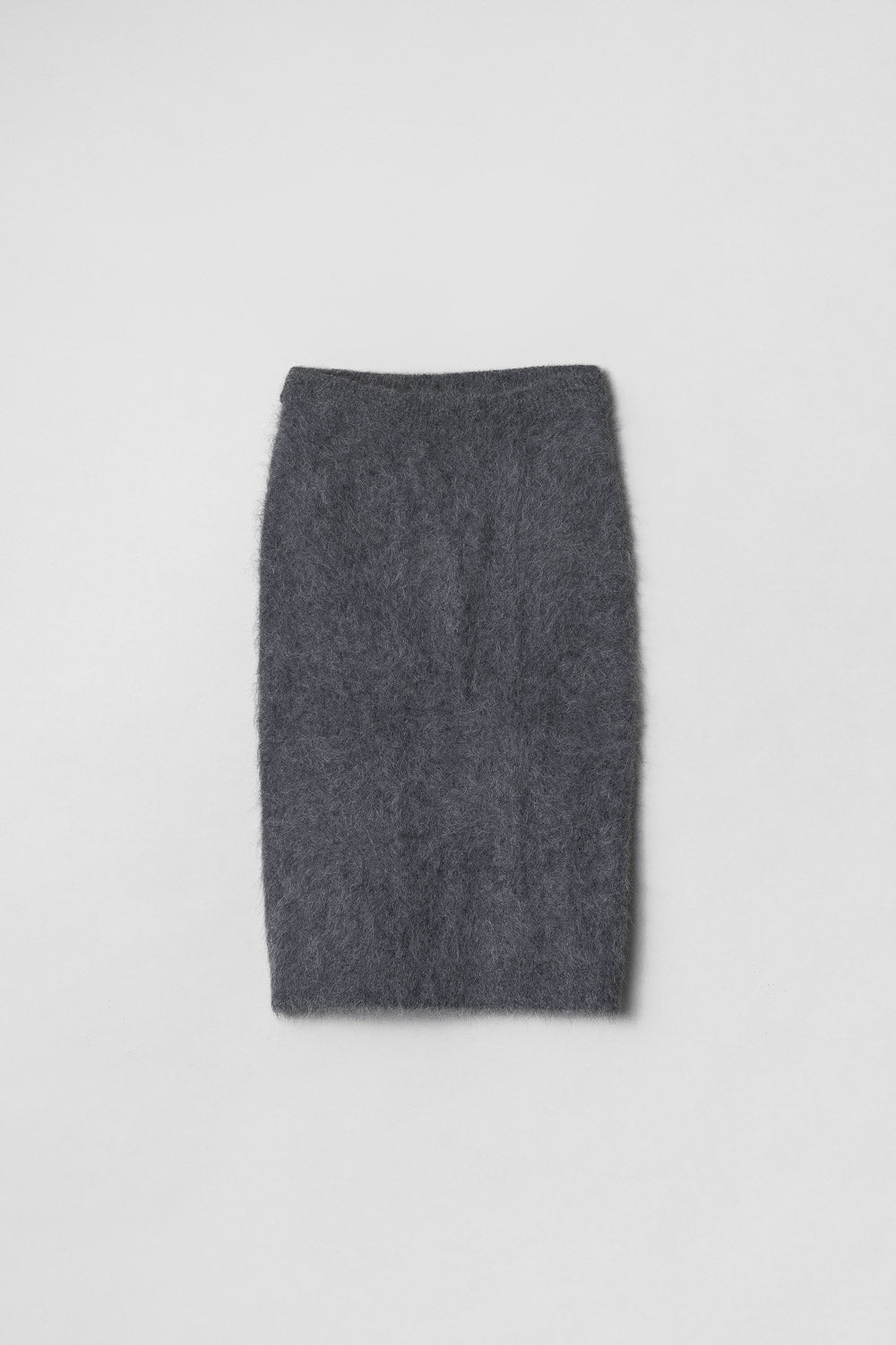 The Mulled Wine Furry Skirt is knitted in a tactile and textural fluffy alpaca wool mix. This snug skirt has a slimline midi silhouette with subtle back split and an elastic waistband that provides extra flexibility and comfort around the waist. Style it with the FWSS White Calico Furry Tee for a tonal outfit.