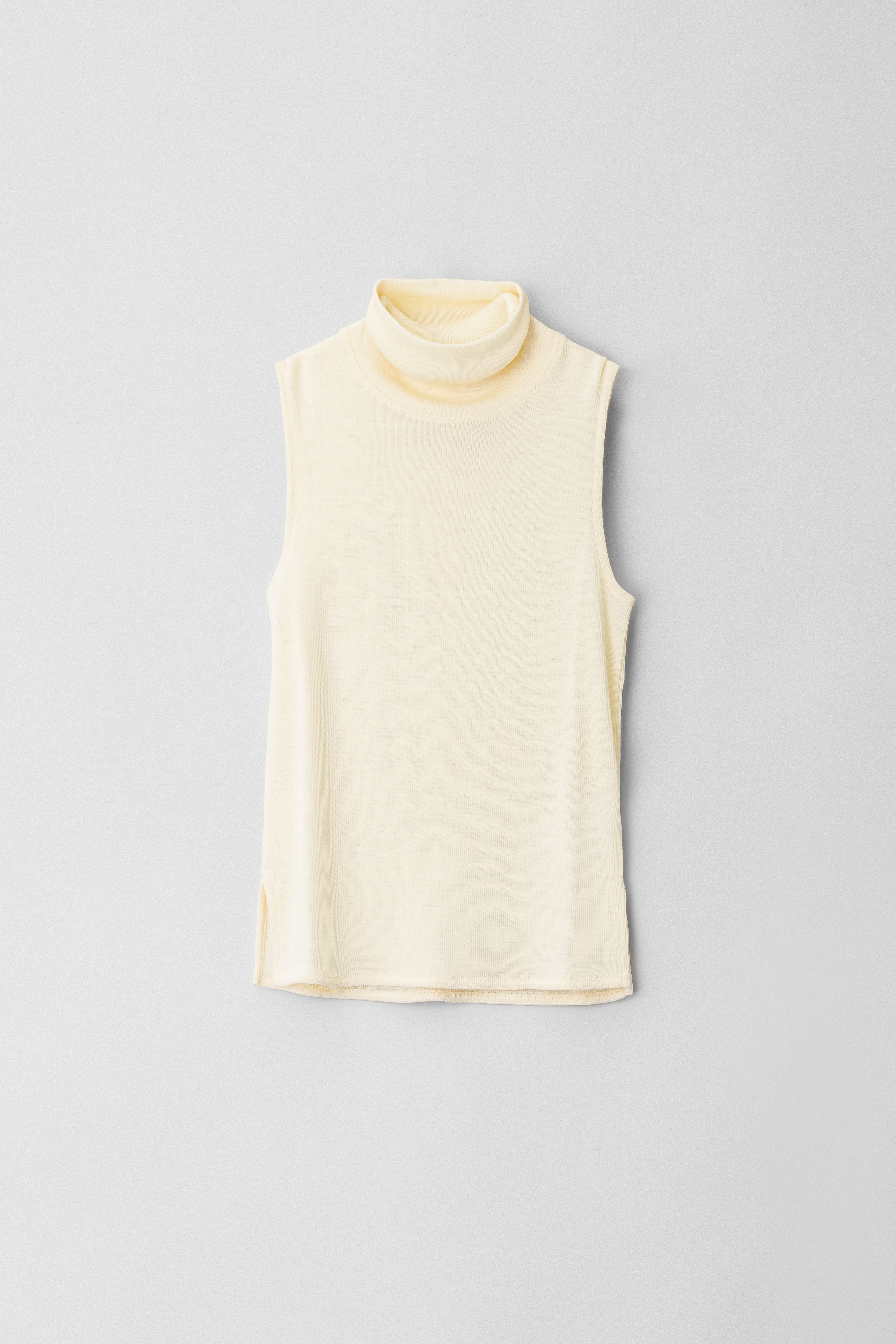 The FWSS No Diggity is a roll-neck tank made of a fine ribbed jersey in 100% wool. The quality used is a deadstock fabric, leftovers, meaning this garment required no new dying process, yarn or fabric production. These processes account for about 80% of the environmental footprint of an average garment. The top features side-slits at the hem and a felled seam at back, is easy to style and ideal for layering. Seeing it is made from leftovers, this top is limited edition.