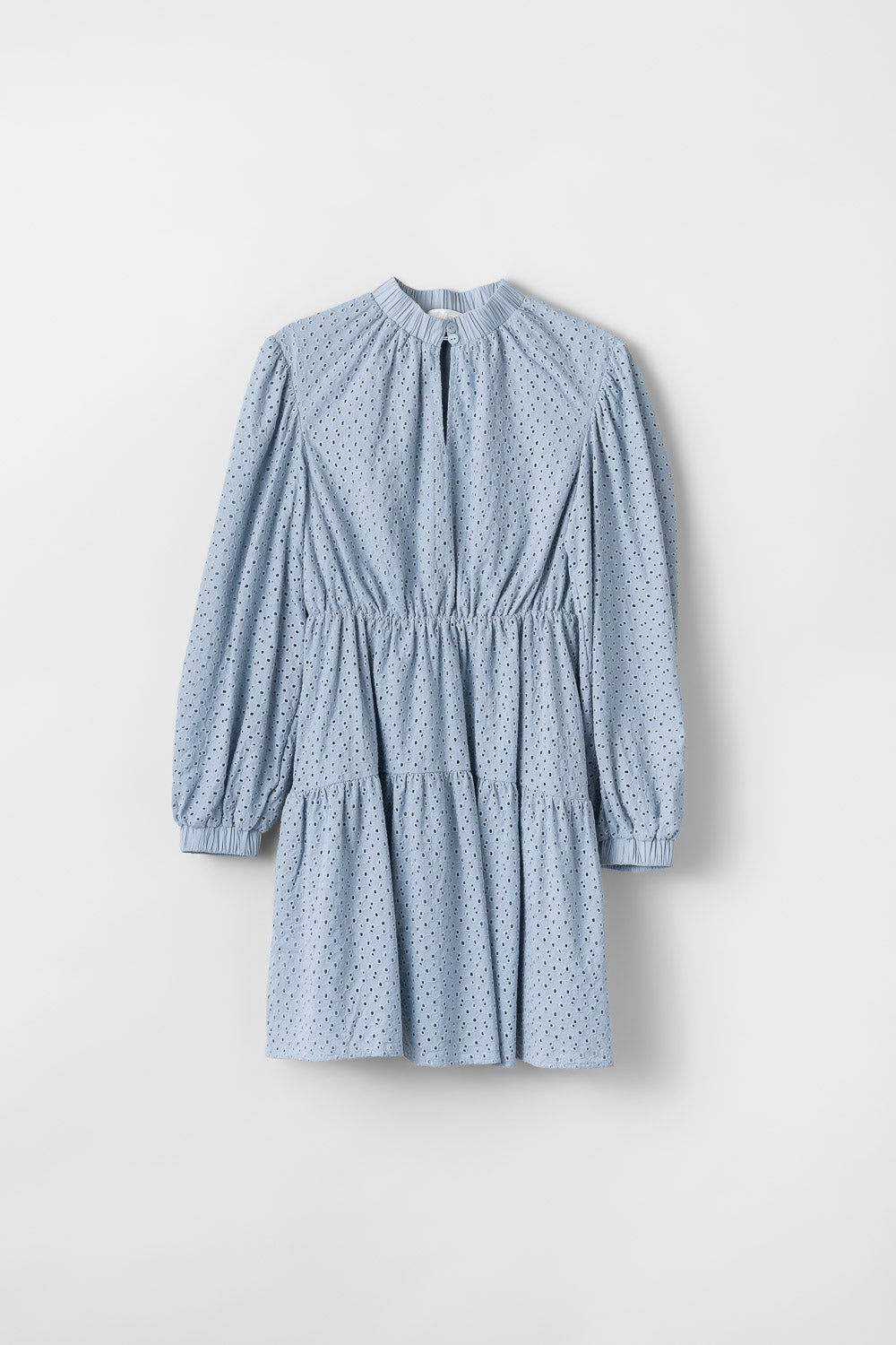 The FWSS Sealed Broderie Anglaise is a long sleeved above the knee length dress cut from a 100% cotton broderie anglaise quality. It features a playful and romantic silhouette, with a clear waistline and shirring details giving the dress it's rich and playful volume. Elastic cuffs and neck band, keyhole detail dropping down from the neckline closed with a pair of buttons. A practical light weight cotton lining of the body, invisible YKK zipper in the side seam. Cotton has excellent absorption abilities making the dress well suited for summertime. A dress to play and live in during our warmer seasons.