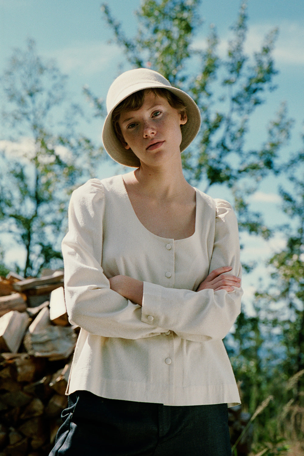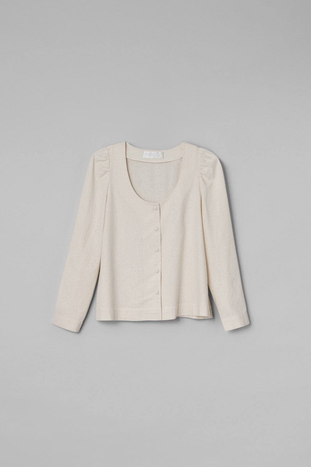 The FWSS Simone is a long sleeved blouse in 100% silk noil. Silk noil is less processed and treated than normal silk and also uses leftover from silk production, so it has a more raw and irregular feel to it. This style is also undyed, leaving a smaller environmental footprint than other silk styles. Features a playful silhouette with a deep scooped neck, shirring at sleeves, a button stand and buttoned cuffs with buttons that are covered in the same silk noil for a clean monotone look.