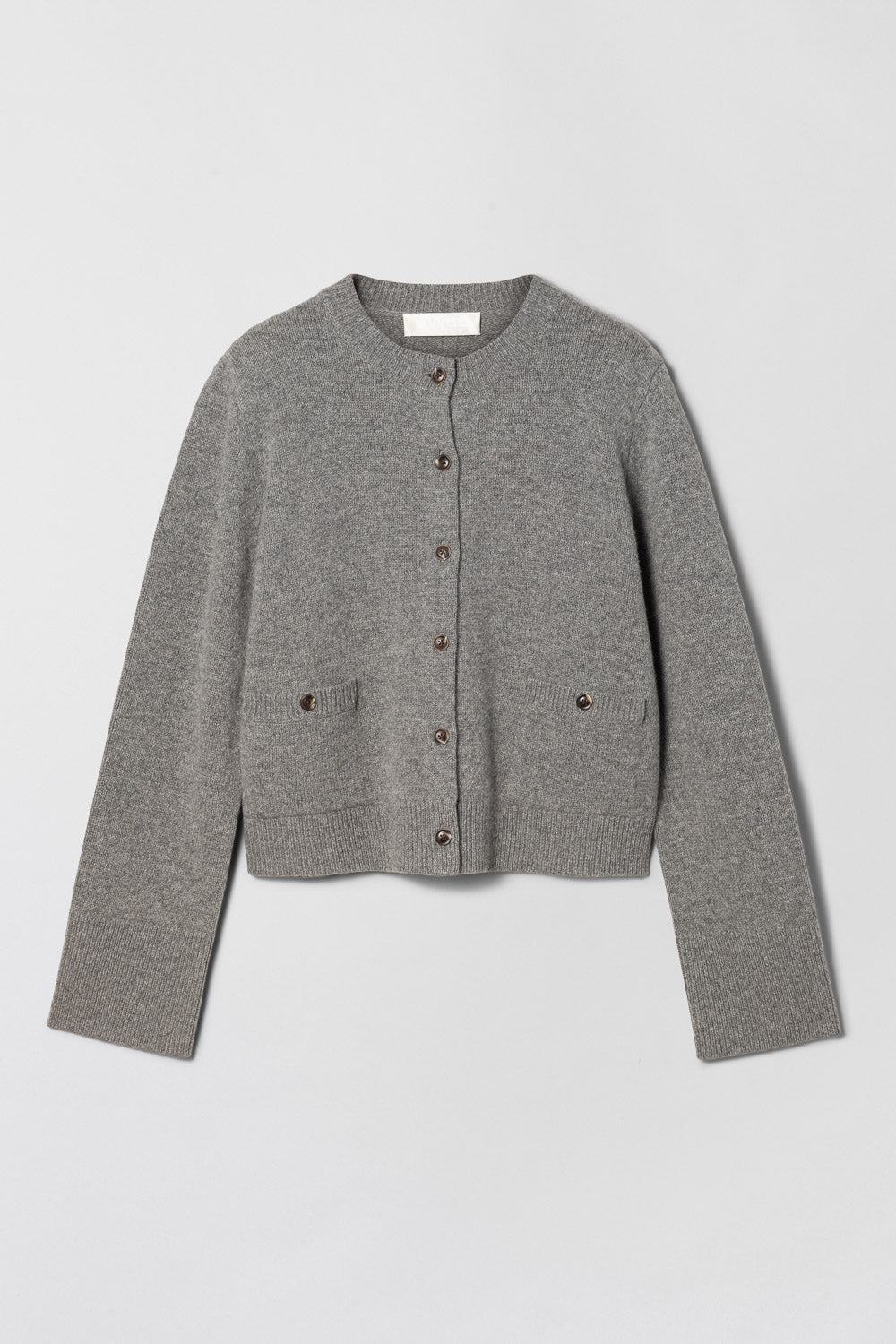 The FWSS Structured Wool Cardigan is made from 100% extrafine merino wool with a soft brushed finish. It features a relaxed fit with a feminine silhouette. The bell-shaped sleeves add volume, making it a versatile piece for everyday wear.