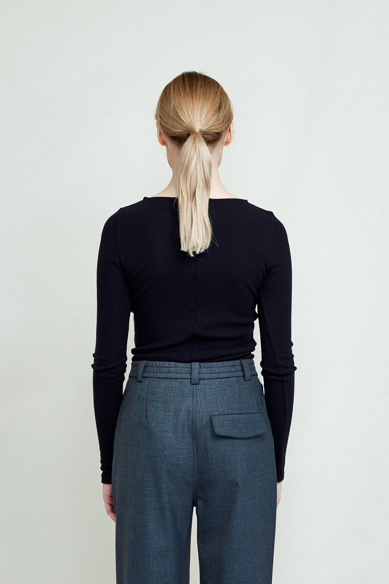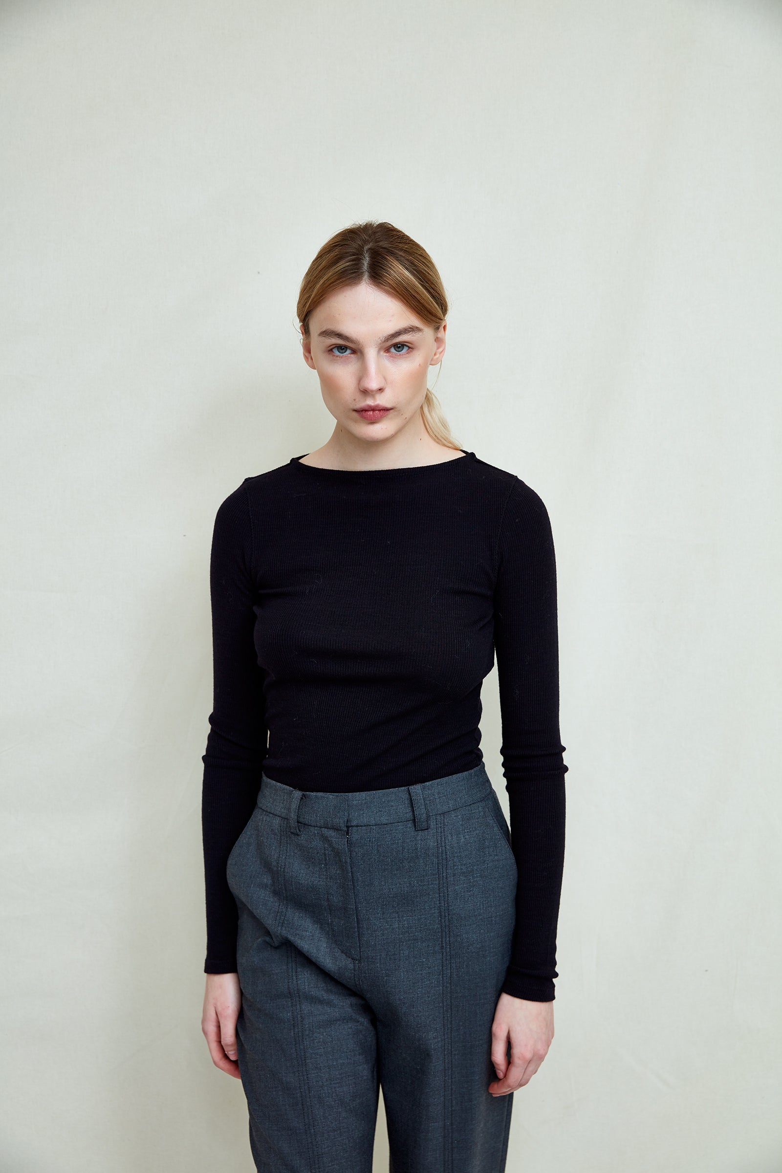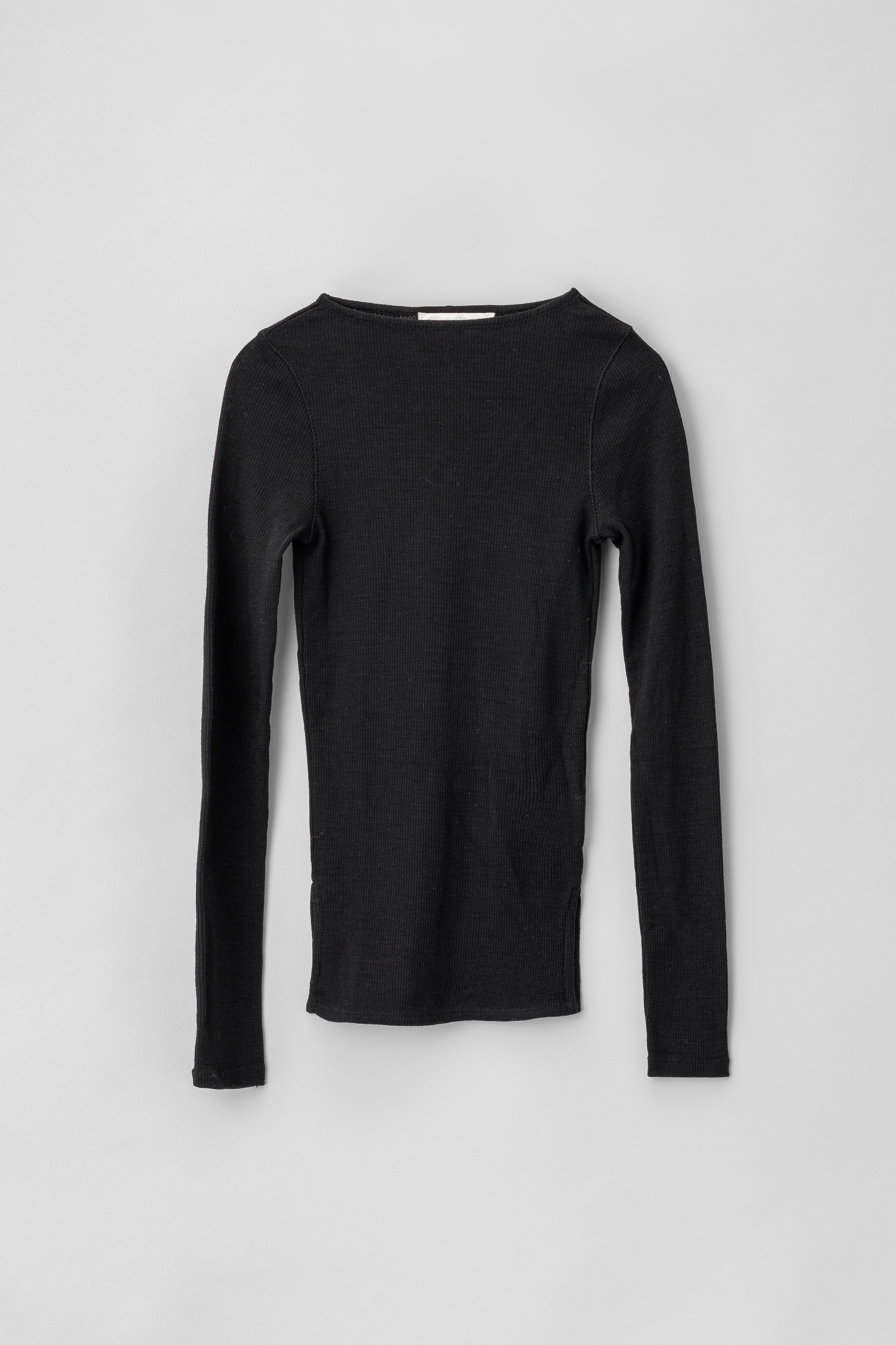 The FWSS Try Again is a light boat-neck top made of a fine ribbed jersey in 100% wool. The quality used is a deadstock fabric, leftovers, meaning this garment required no new dying process, yarn or fabric production. These processes account for about 80% of the environmental footprint of an average garment. Featuring long sleeves, side-slits at hem and a decorative cut-seam at back. The form-fitting silhouette makes it perfect for layering. Seeing it is made from leftovers, this top is limited edition.