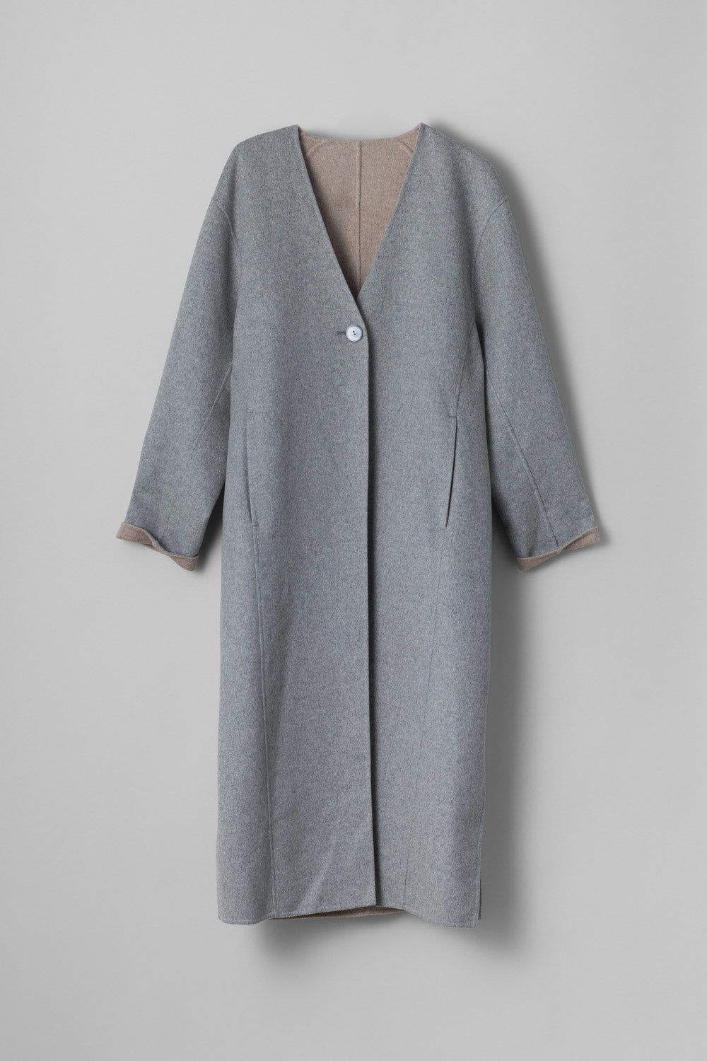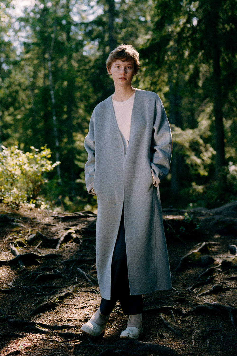 The FWSS Wabi Coat is a beautifully crafted coat in a soft warm bonded wool mix fabric that is 50% recycled. Features dropped and rounded shoulders, sleeves with a raglan construction at back, single button closing, fold-up cuffs and slits in the side seams. The coat is unlined, giving it a more draped and close to body look, with a subtle contrast colour inside of the two-faced fabric also revealed at cuffs.