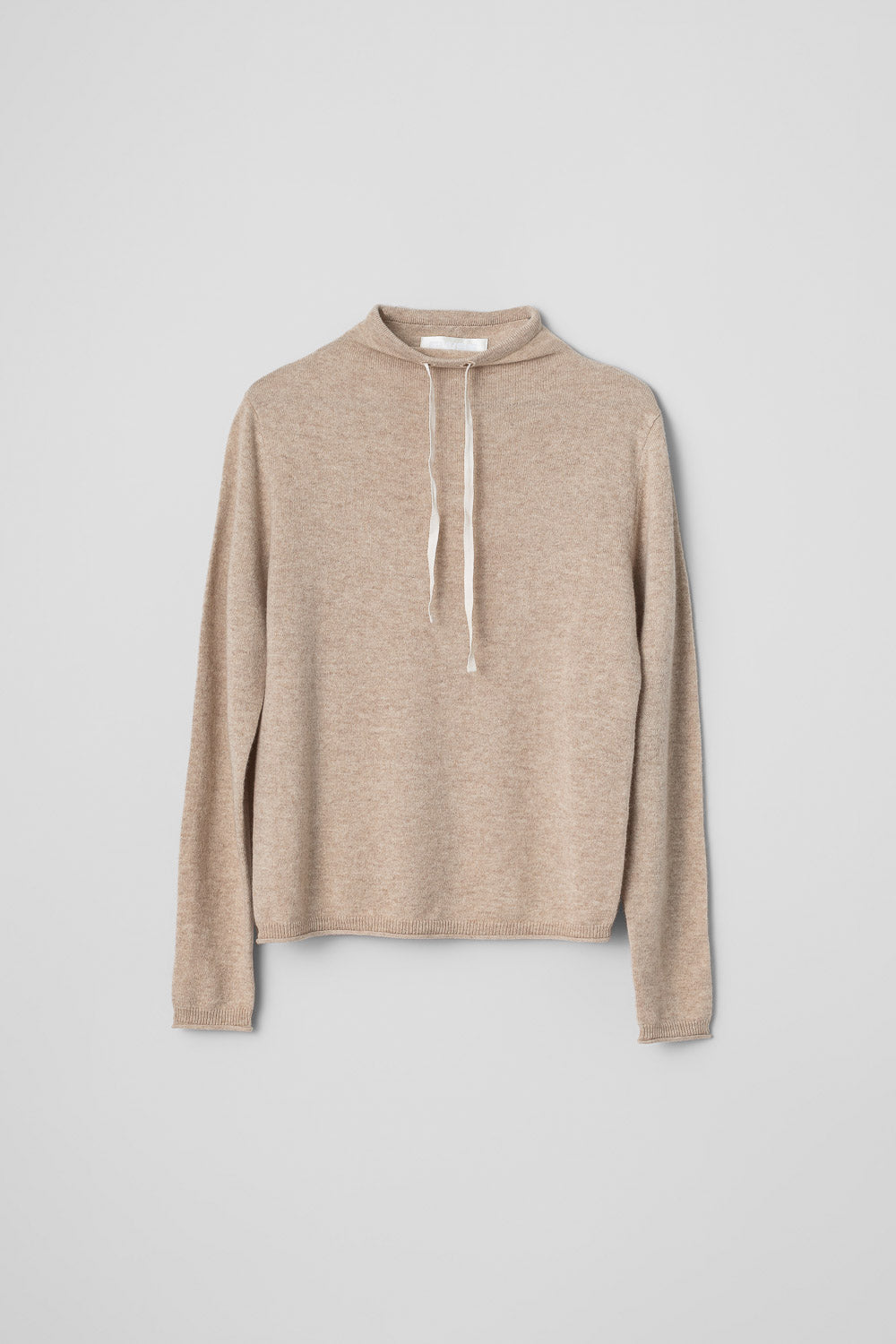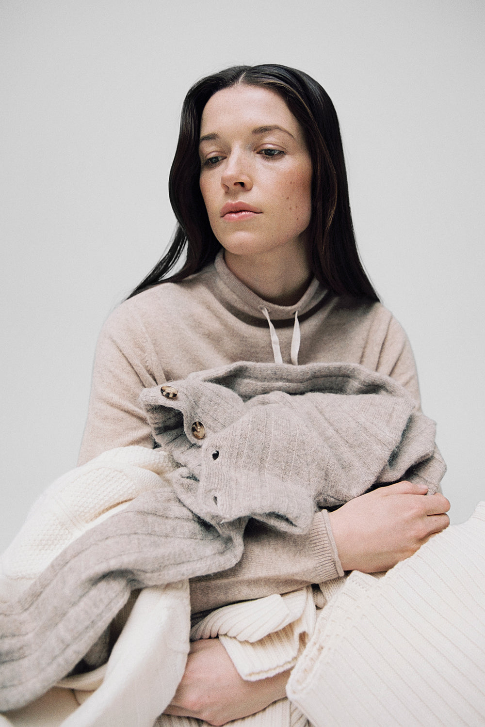 The FWSS Waterfalls 2 is a long sleeved luxurious pullover knitted from an undyed 100% cashmere yarn. This style only comes in two earthy colours, both naturally occurring on the cashmere goats. Eliminating the dyeing process saves a lot of water, energy and chemicals compared to normal production. The style has a semi-high neck with drawstrings made of undyed cotton and subtle rib-and-roll cuffs and hem.