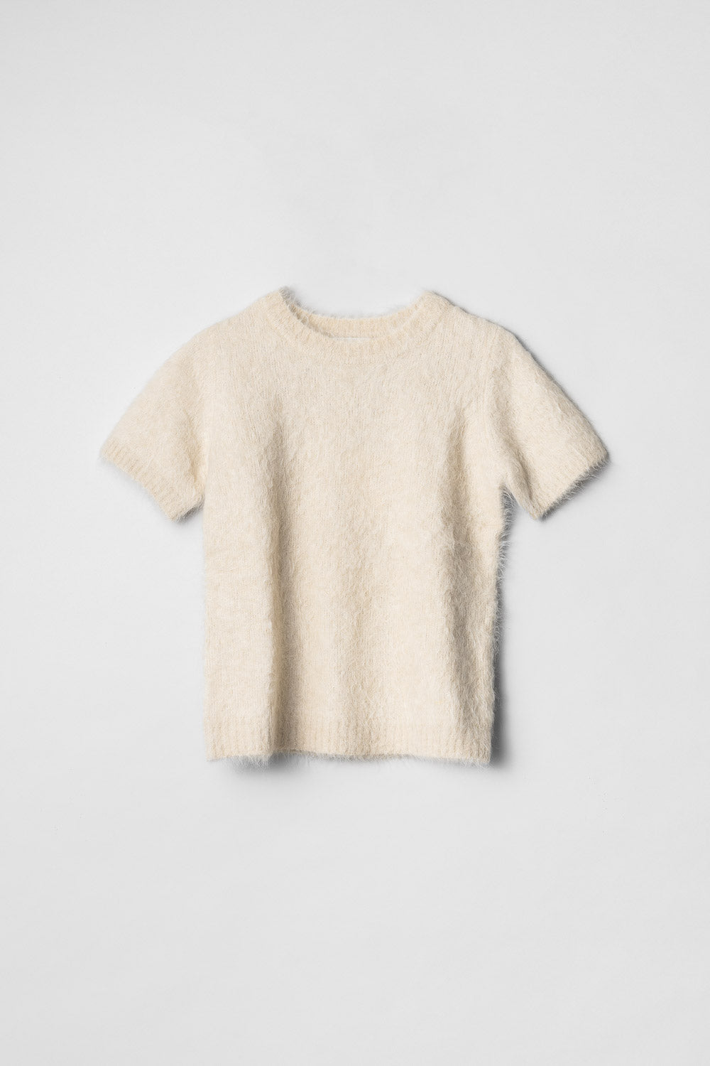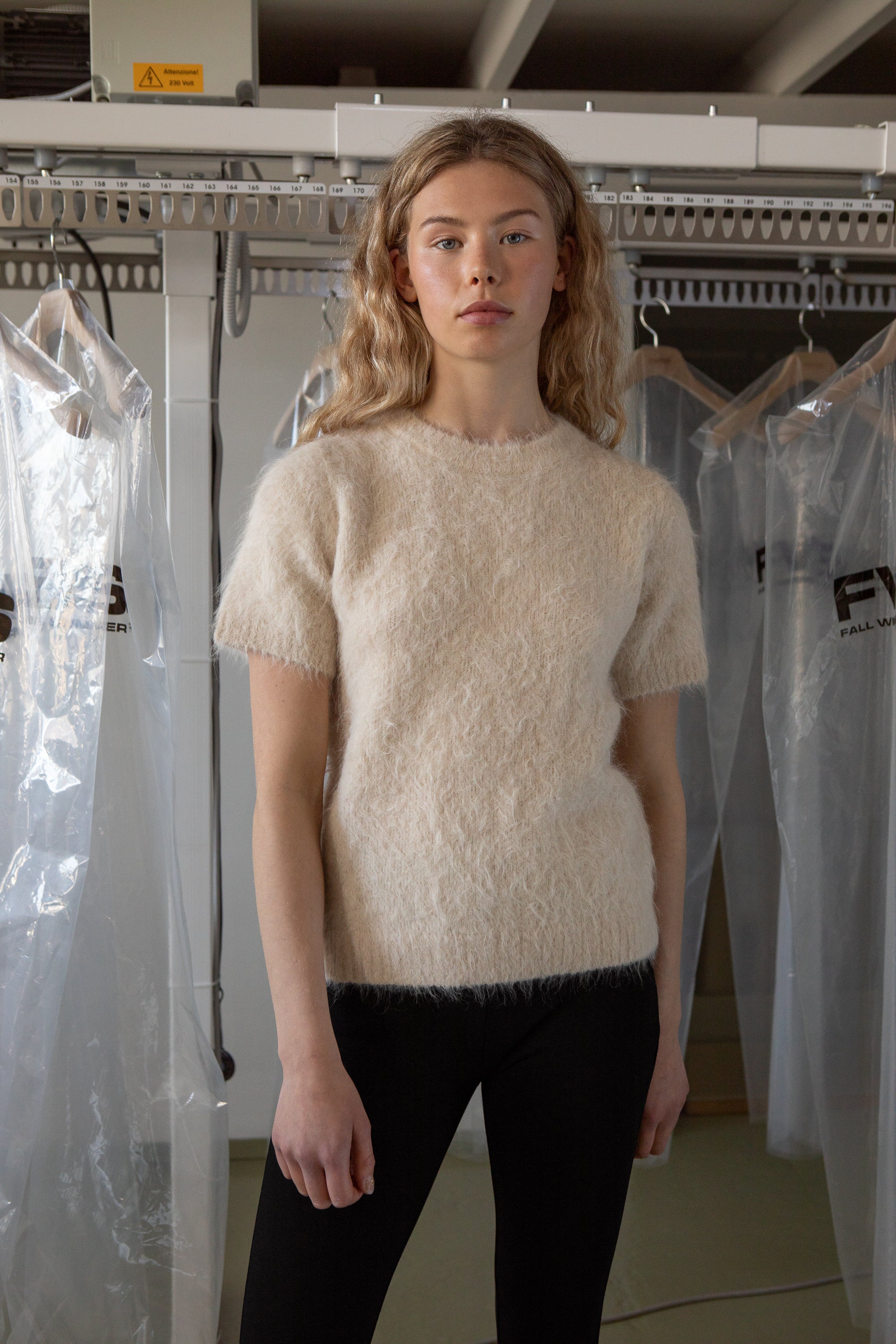 The FWSS White Calico Furry Tee is knitted from a soft, furry alpaca wool. This cozy tee has a delicate round neck and a relaxed fit and is as cool as it is comfortable. Pair it with the FWSS Mulled Wine Furry Skirt and high boots for a chic look.