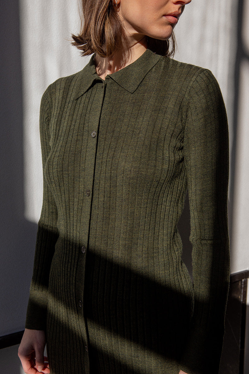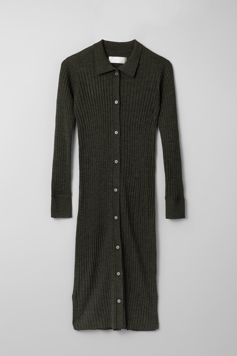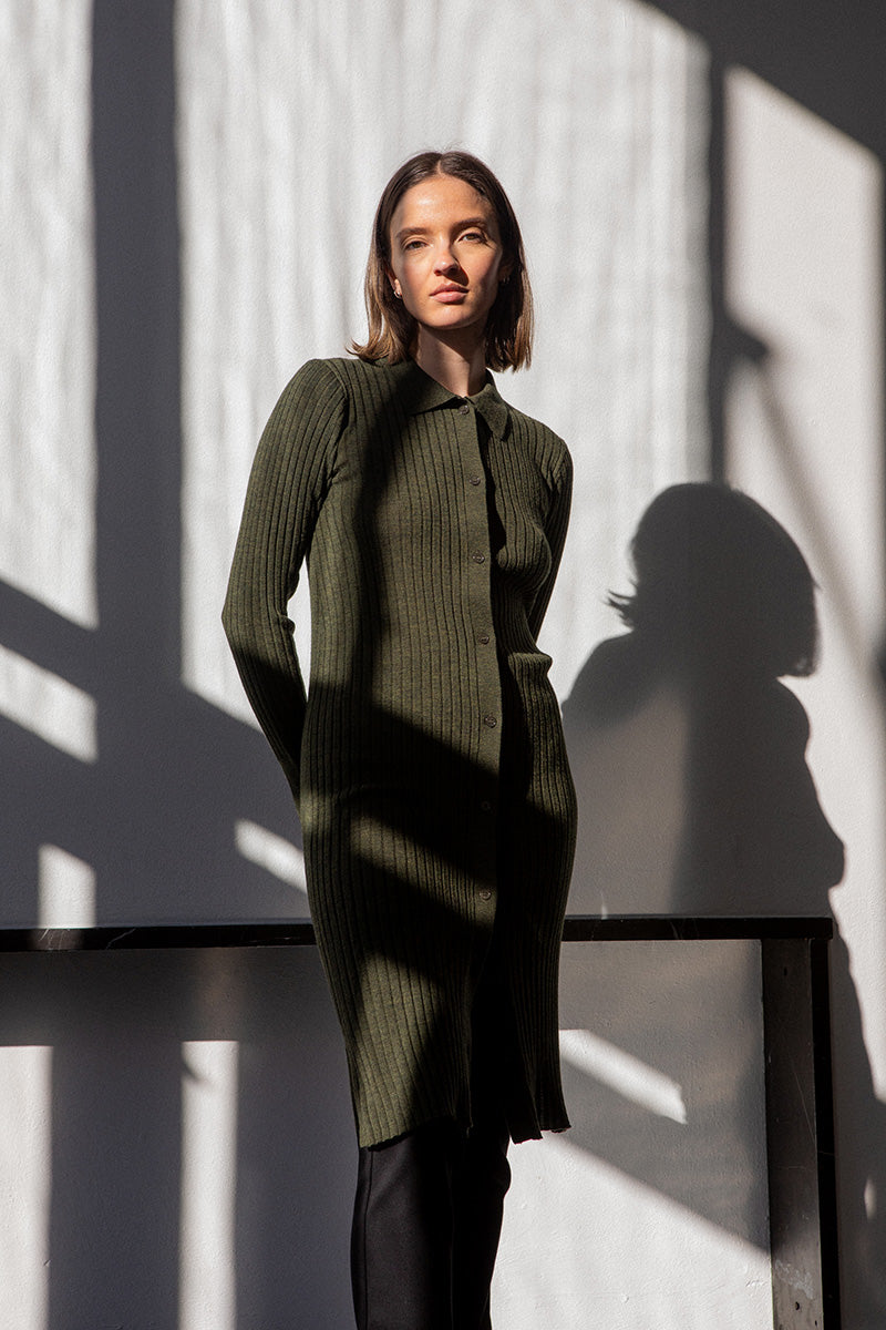 The FWSS Yugen Dress is an elegant form-fitting midi-dress crafted from soft merino wool. Features a flattering ribbed material, longline cuffs, discreet slits on the sides and subtle buttons. A structured fit through the bodice makes it a chic stand-alone. The neck and bottom can be left unbuttoned for layering. Style with colorful leggings or bootcut pants.