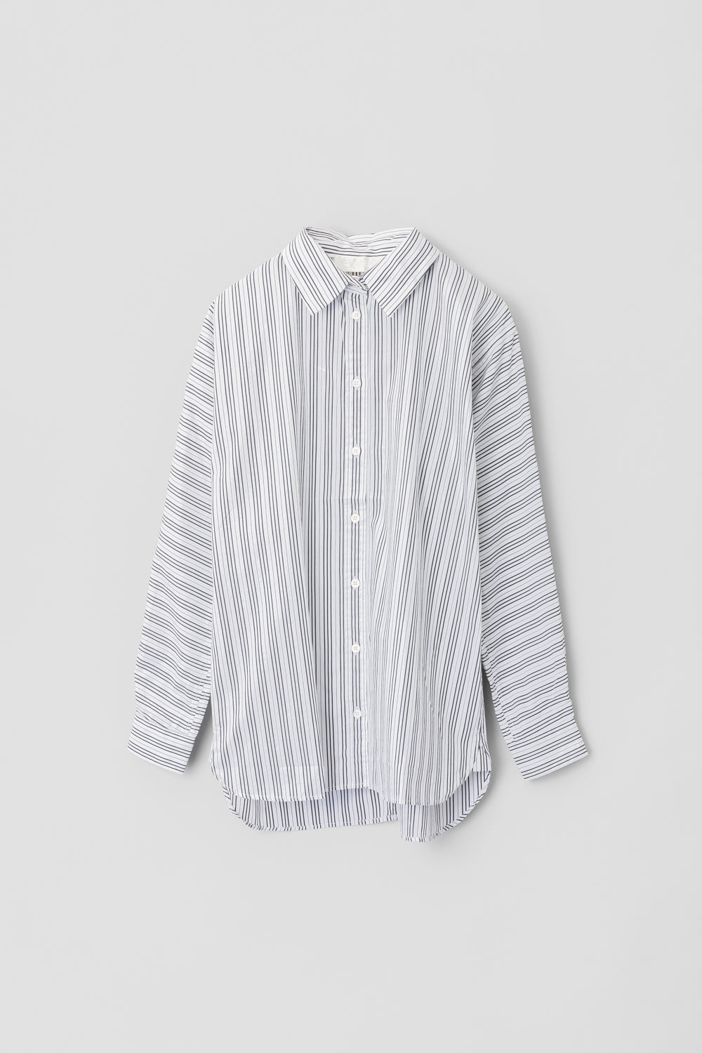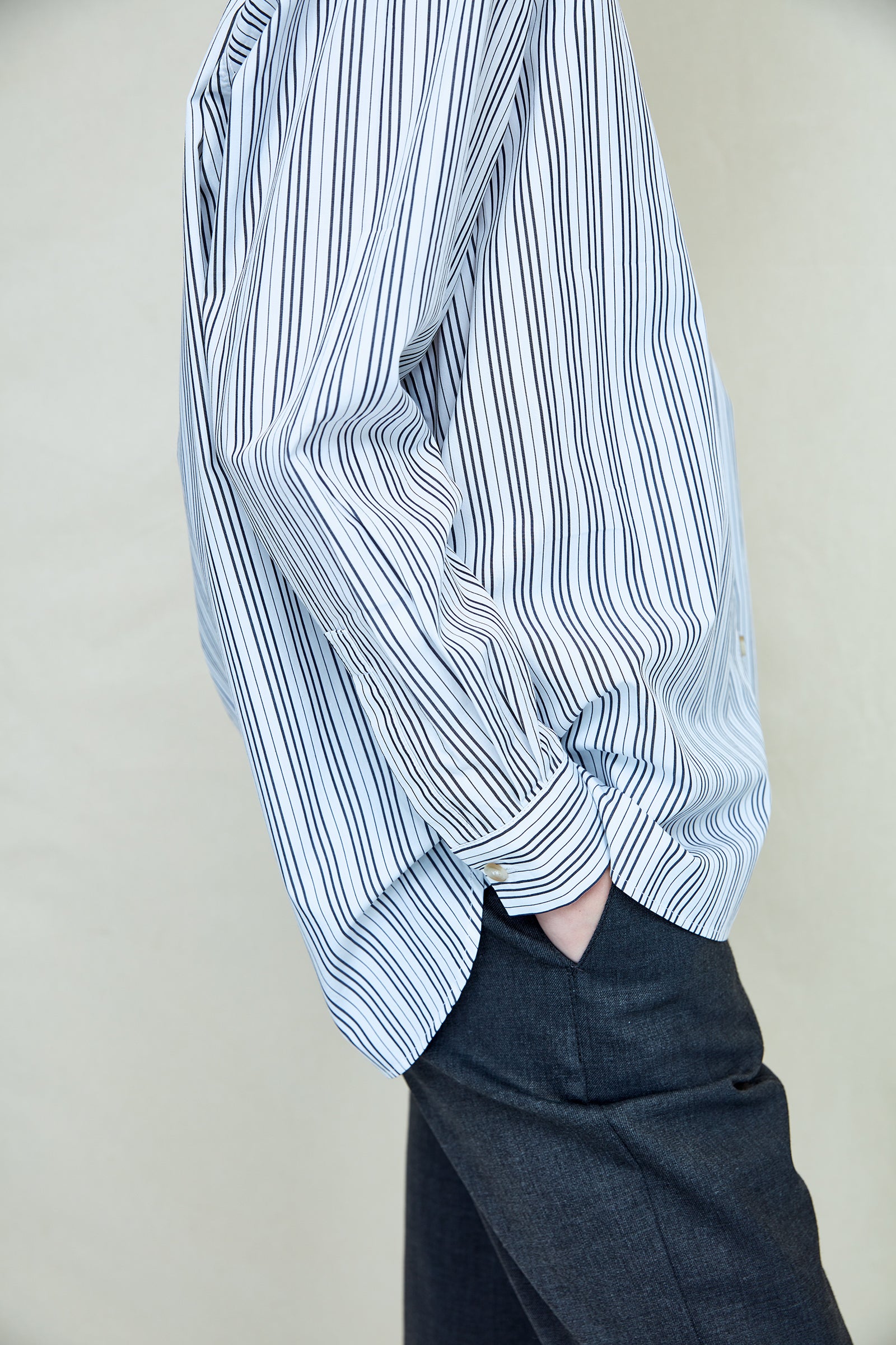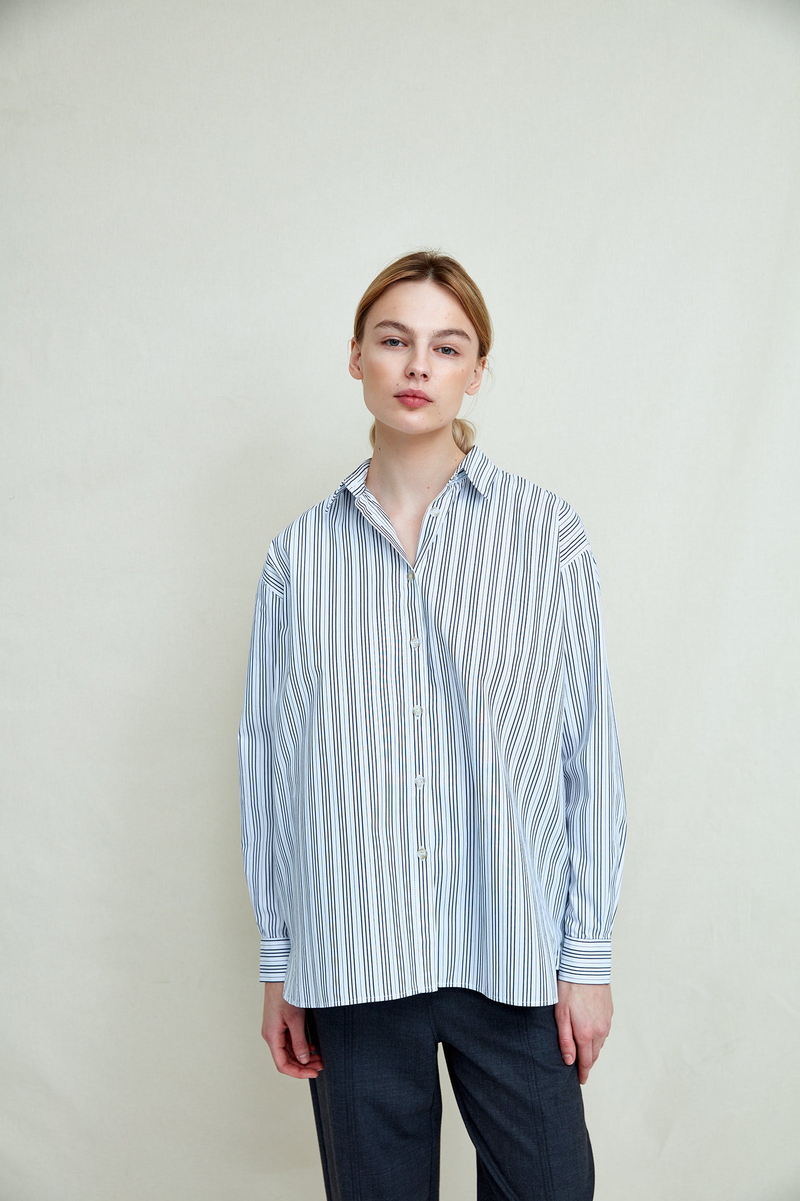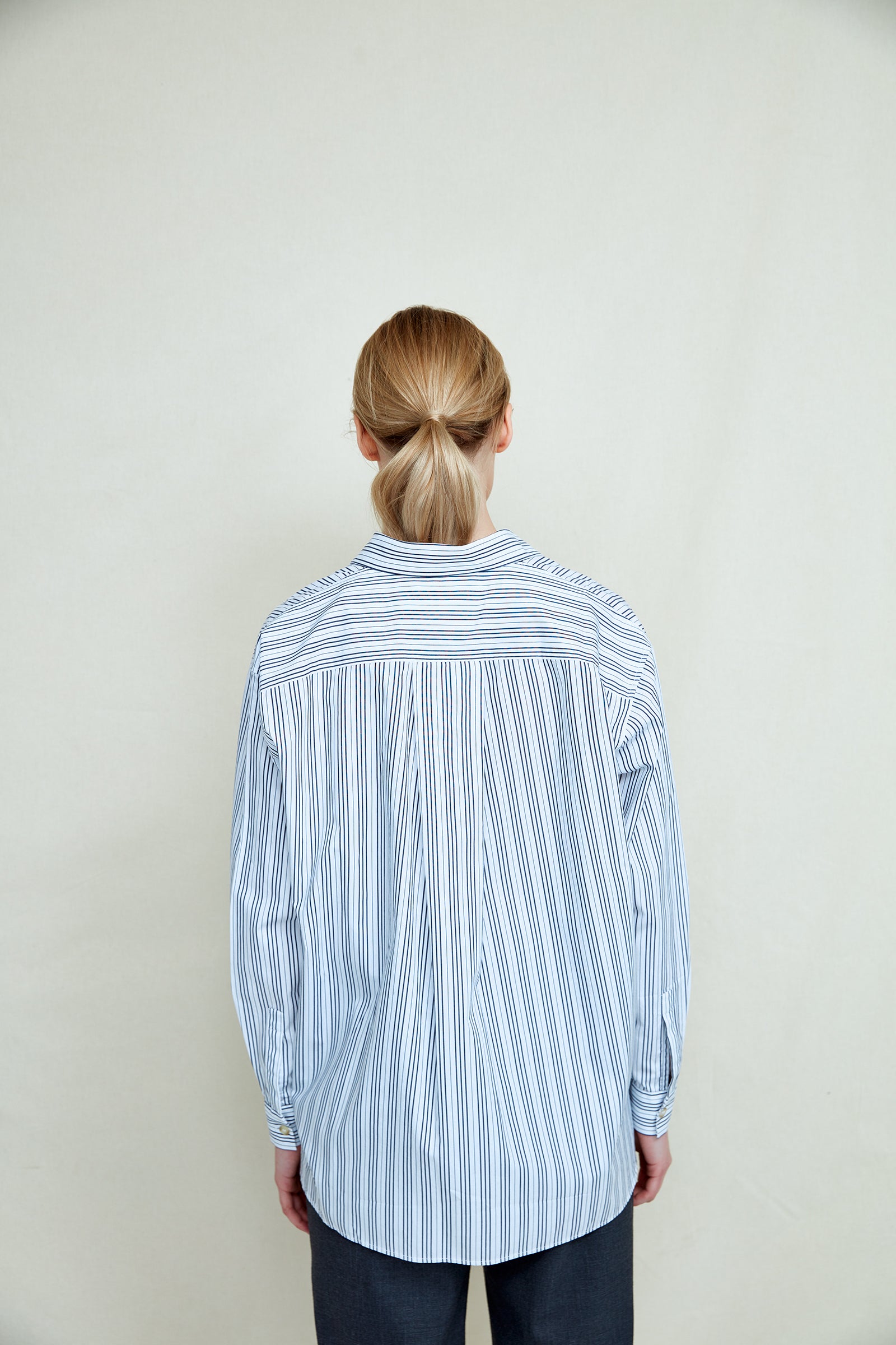 The FWSS Rakel 2 is a medium sized classic menswear inspired shirt made from crisp 100% organic cotton. Featuring slightly dropped shoulders and a kimono-inspired back sleeve, with topstitch details, visible button-stand, clean collar and cuffs and a rounded hem. The shirt has a relaxed fit.