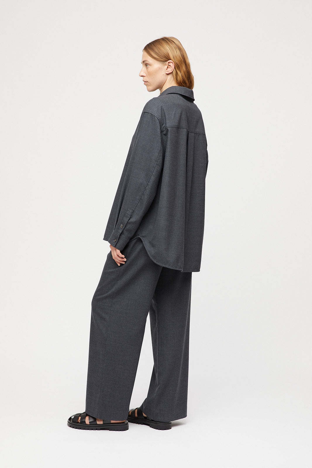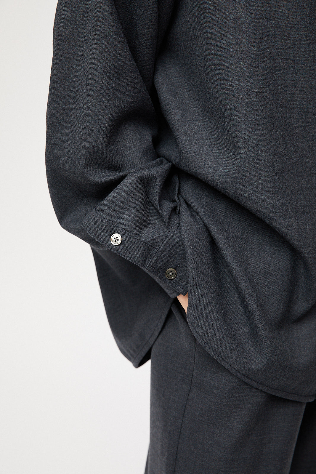 The FWSS Tailored Oversized Shirt is a refined piece crafted from slightly brushed wool, providing a soft yet durable quality. This shirt draws inspiration from classic workwear, featuring a button-down closure for a secure and traditional look. The cuffs are designed with slit and button details, adding a stylish touch. A curved hemline enhances the overall fit, allowing for ease of movement and a polished finish. This shirt seamlessly merges functionality with timeless style, making it a versatile addition to any wardrobe.