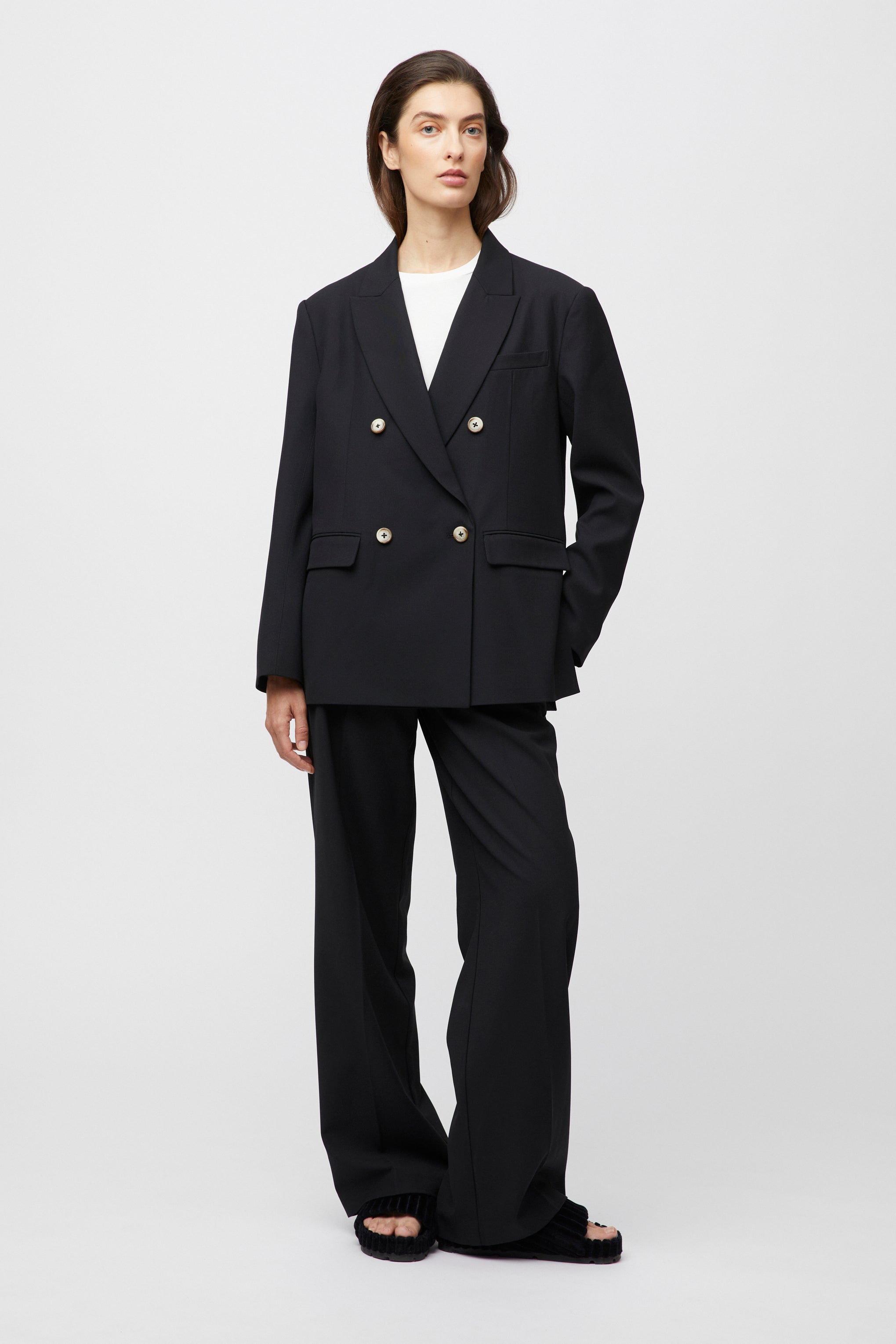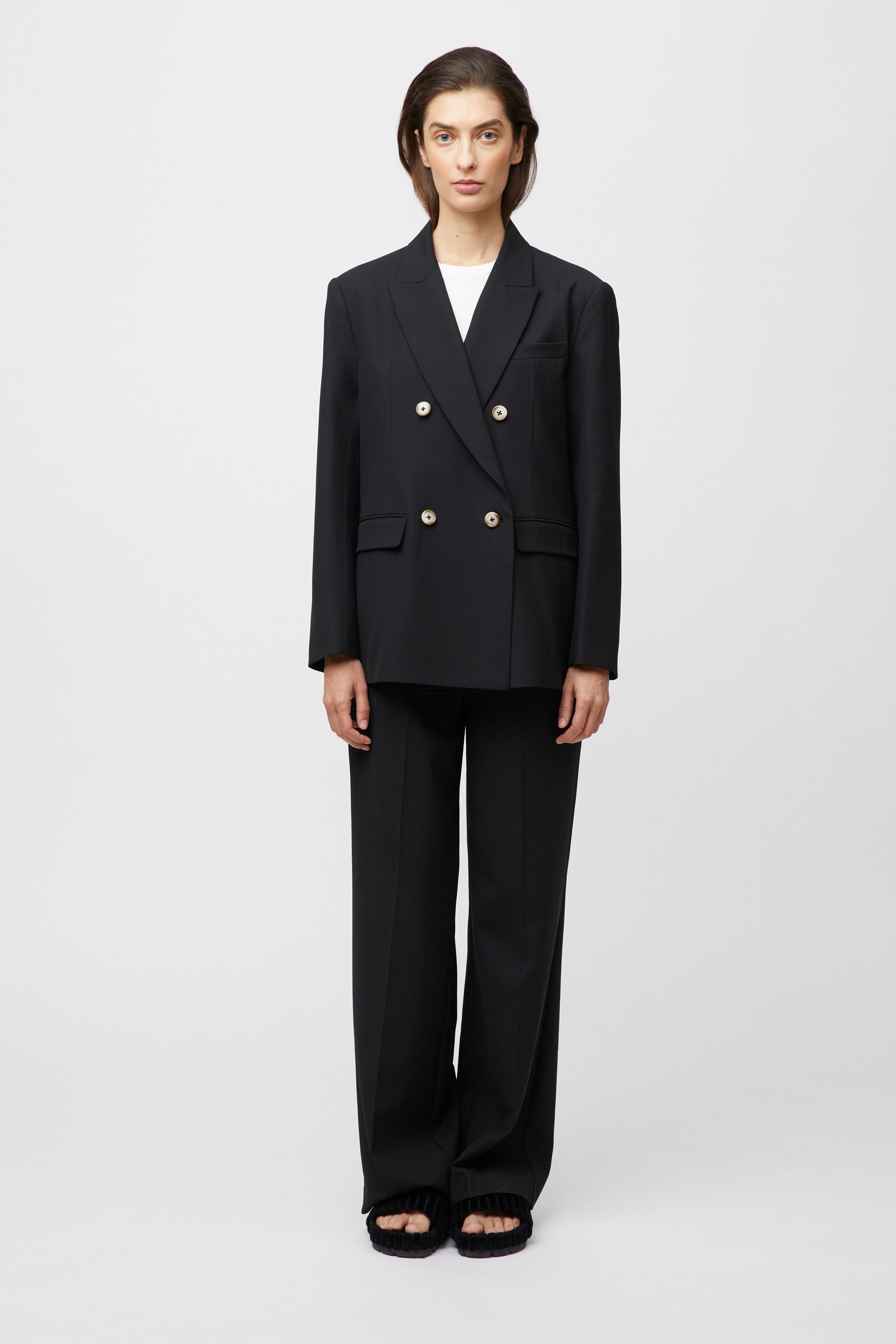 The FWSS Blue Line Blazer is a relaxed double-breasted blazer cut from smooth, high-quality wool. The slightly loose silhouette makes layering fun and easy. A timeless power piece that will boost any wardrobe. Style it with the FWSS Barbro Wide Leg for a smart look.