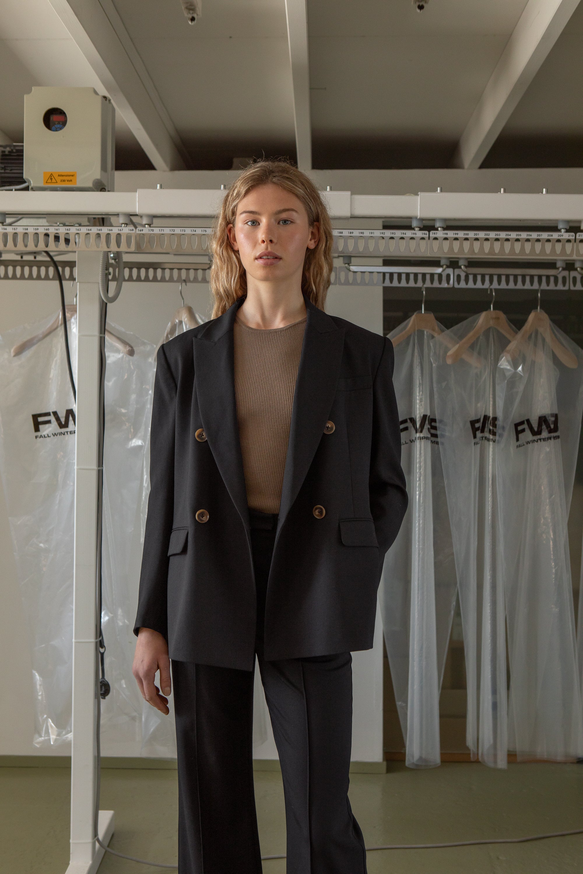 The FWSS Tailored Suit Jacket is a classic double-breasted blazer crafted in the finest wool mix woven twill fabric. Featuring a structured shoulder line, slightly oversized fit and slits at side seams allowing a relaxed fitting while maintaining a sharp silhouette. Subtle pocket detailing at waistline and chest give a nod to classic menswear detailing. Complete the look with the matching Tailored Wool Flares.