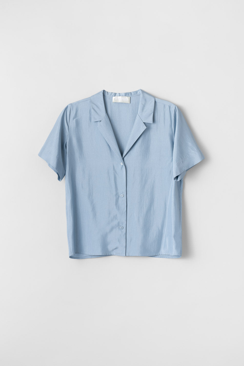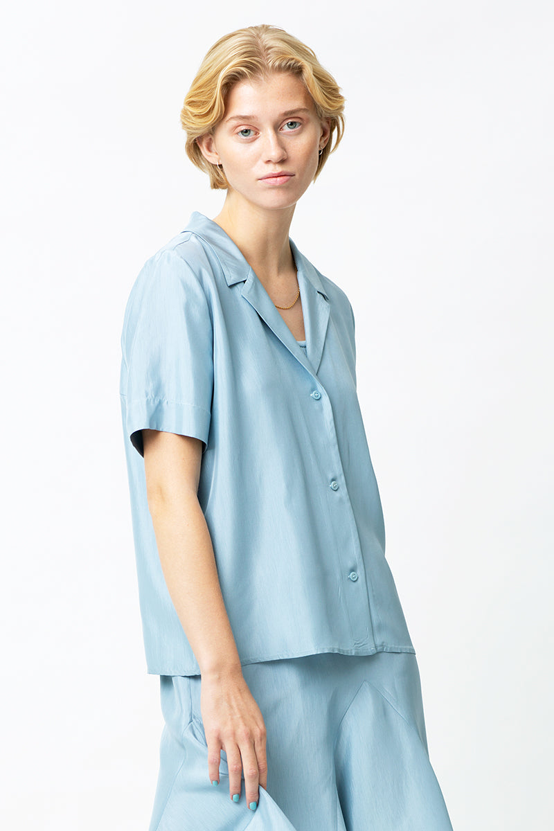 The FWSS Hong Kong Garden is a short sleeved shirt blouse cut from a lustrous 100% acetate quality. The satin fabric is reversed, so it has a nice silky feel inside and a more matte surface outside. Features a notched collar, a relaxed fit and visible button stand in front.