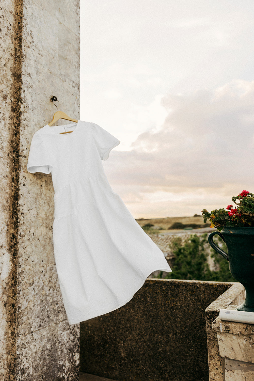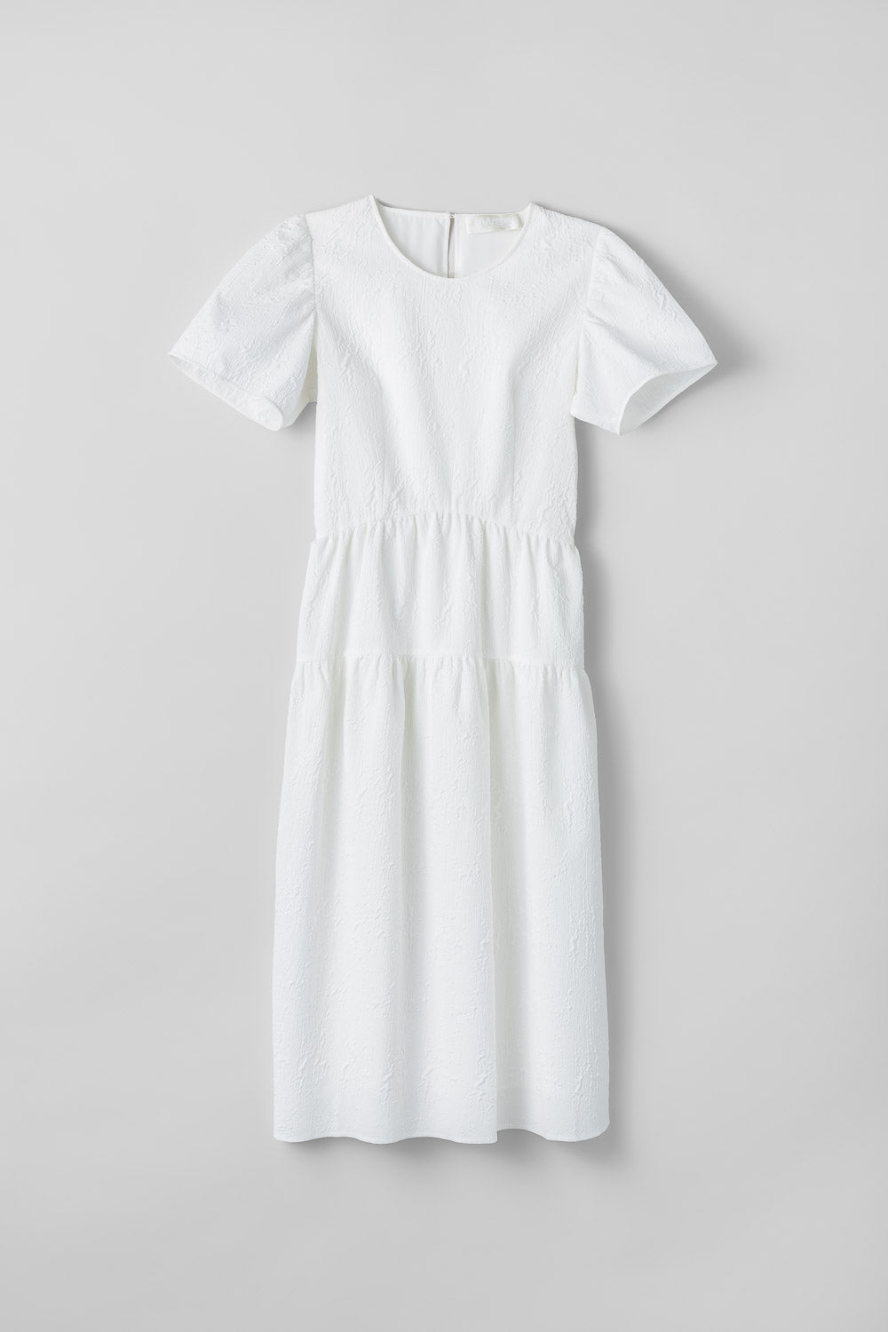 The FWSS Late Nights Dress is a short sleeved midi dress cut from a deliciously textured quality. The dress features a playful silhouette with shirring details and curved cutlines. A subtle keyhole detail dropping down from the neckline at back closed by a button, invisible YKK zipper in side seam. Color Star White comes with practically lined body. As per the title, it is the perfect late nights dress for summer parties, weddings or when you feel like dressing up for no other occasion but just that one.