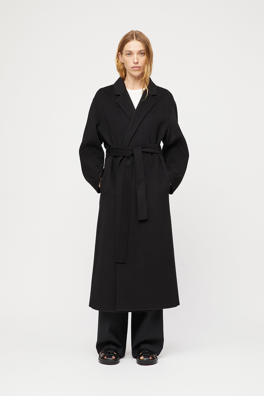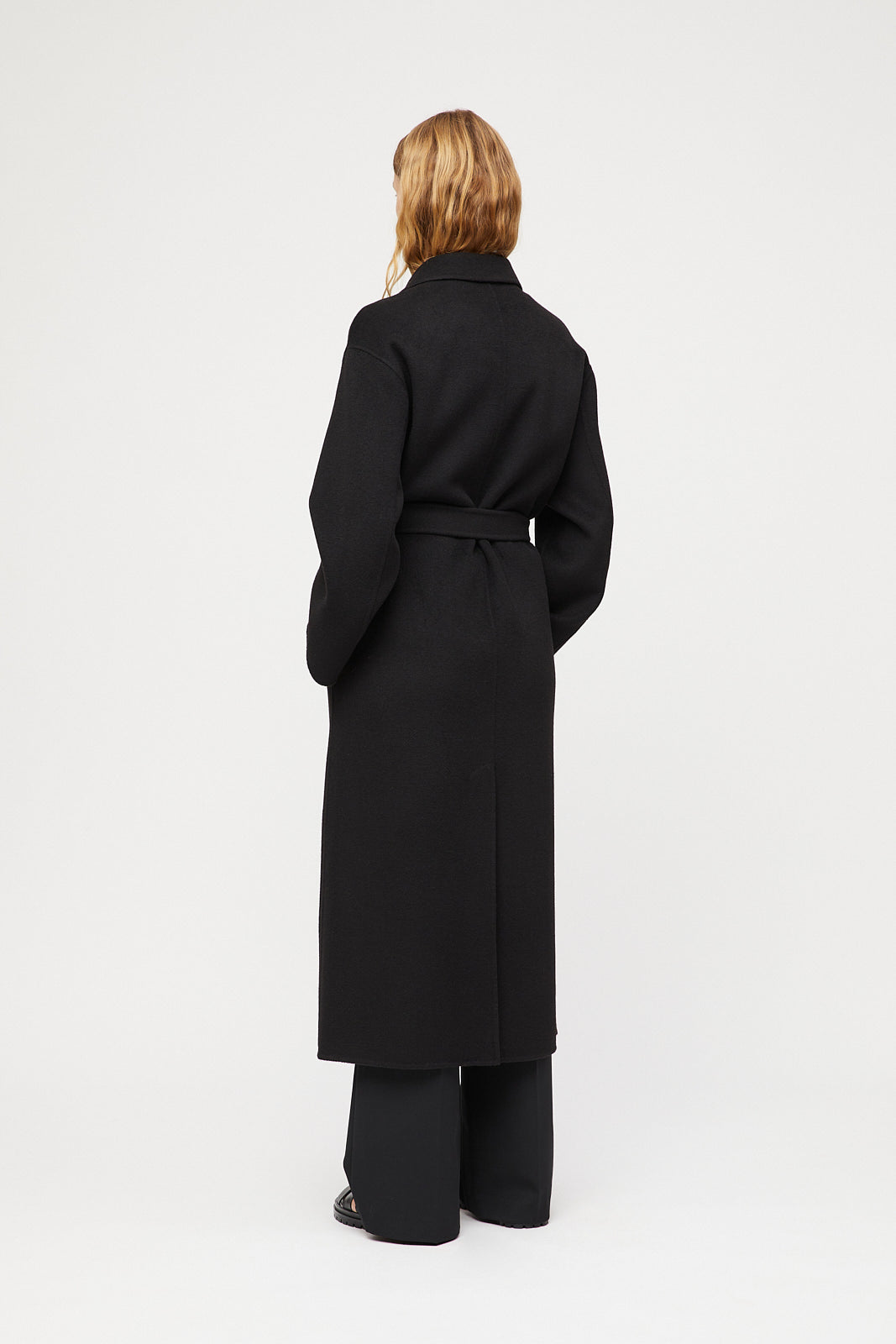 The Doublé Wrap Coat is made from 100% doublé wool – a doublé-woven fabric offering structure and softness. Inspired by 90s silhouettes, it features a maxi length, matching wrap belt, and practical details including side pockets and a back slit. A timeless layer for cold seasons. Style over the Cape Cod Turtleneck and Cigarette Pants for a complete look.