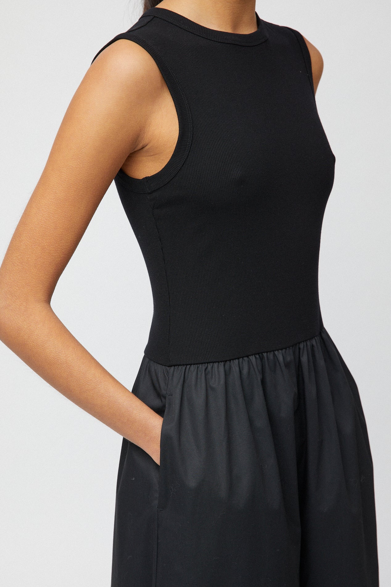The FWSS Drop Waisted Dress is crafted from a mix of cotton, silk, and wool for a soft and breathable feel. The ribbed tank top in a Tencel-wool-silk blend connects to a gently gathered cotton skirt, creating a low-waist silhouette with a flattering drape. Elastic waistband and hidden side seam pockets add comfort and function.