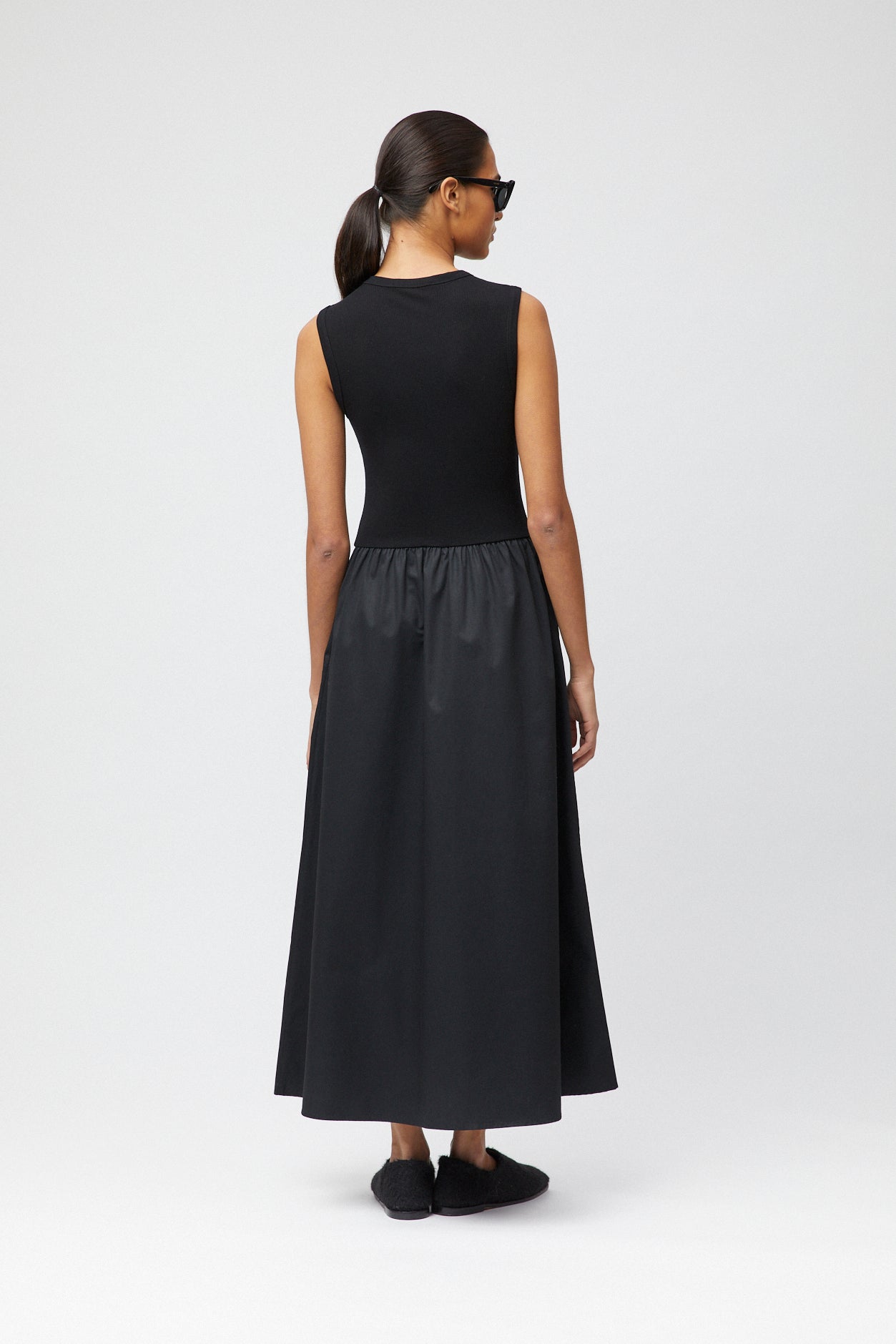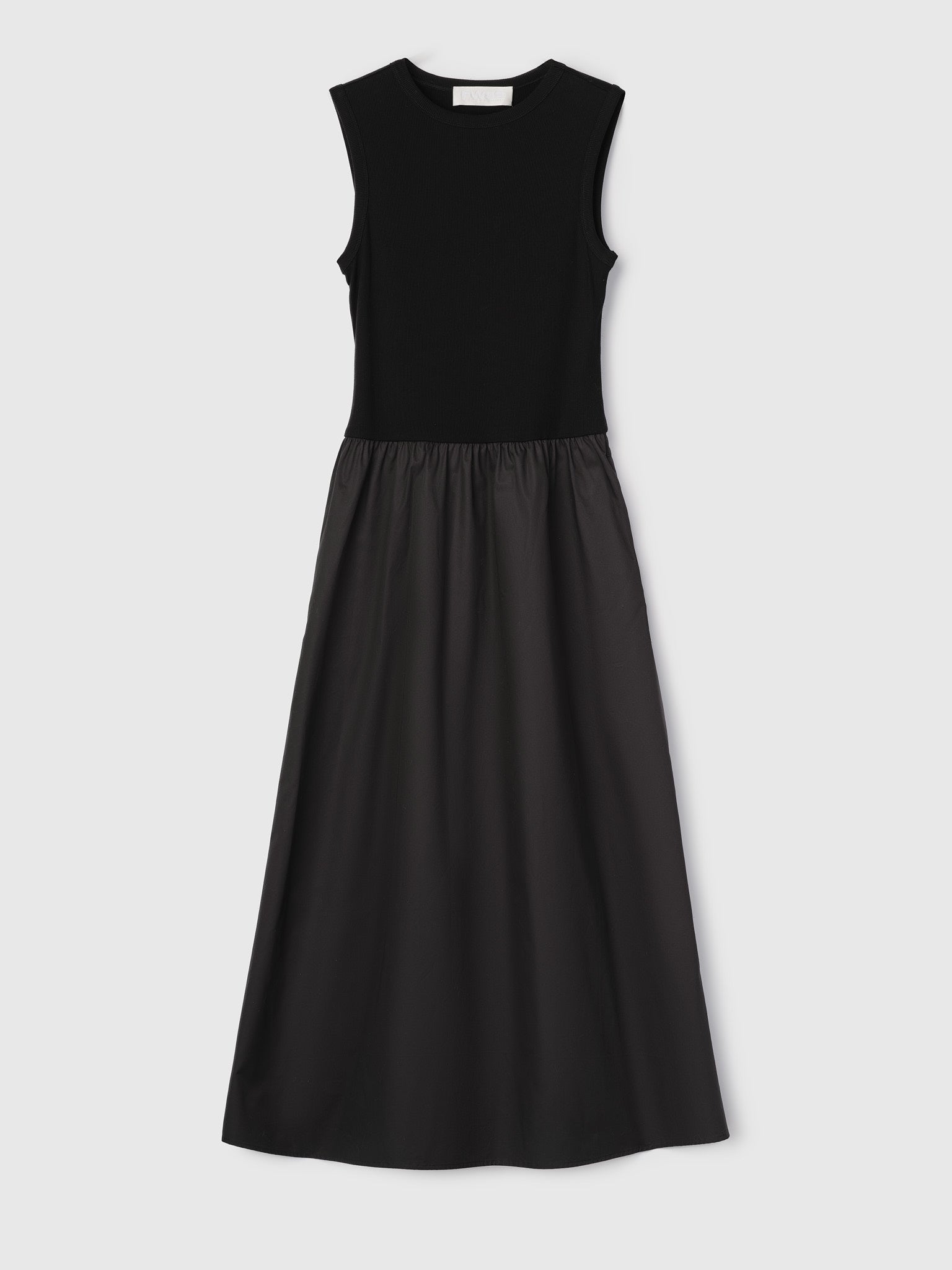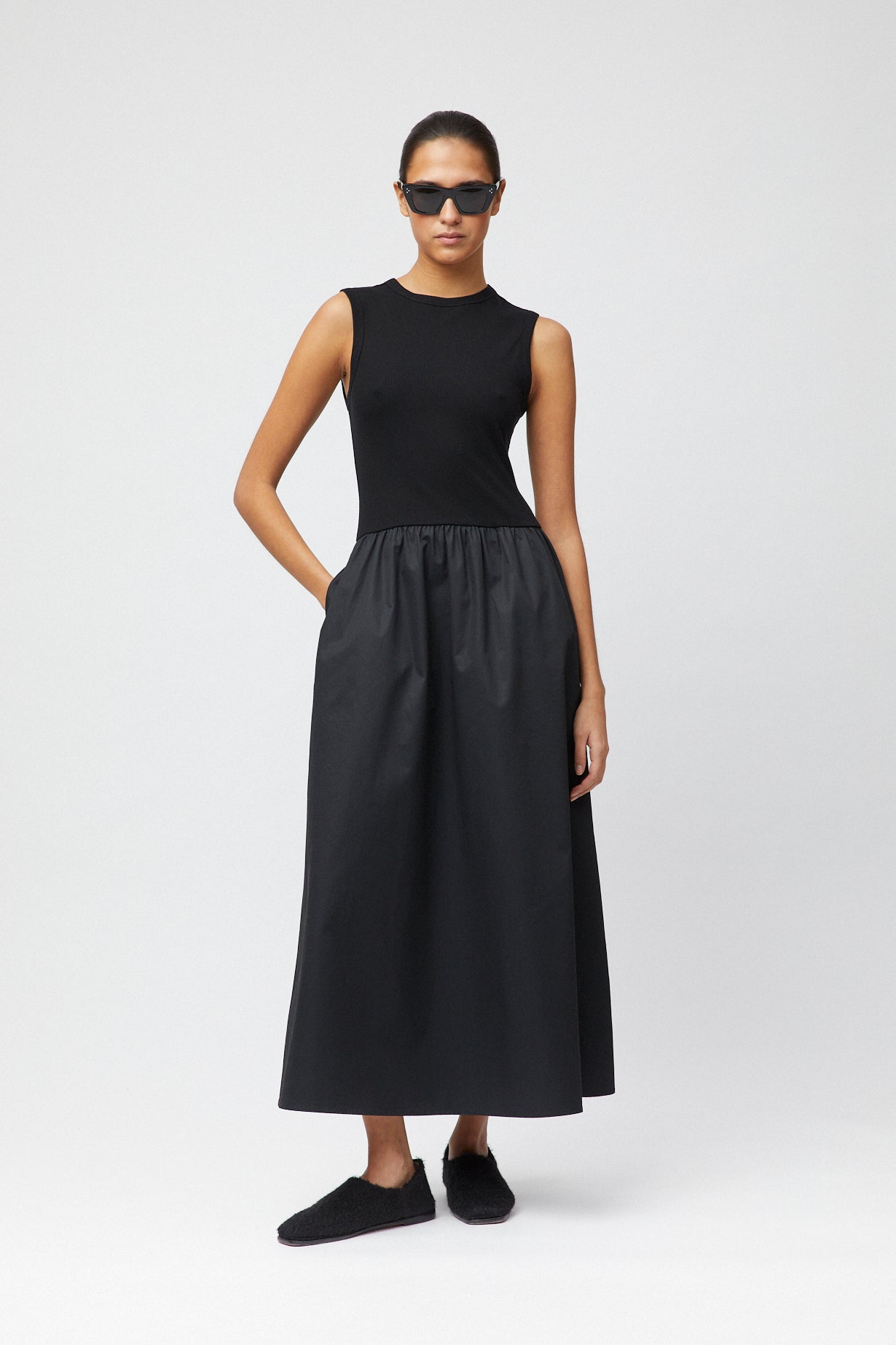 The FWSS Drop Waisted Dress is crafted from a mix of cotton, silk, and wool for a soft and breathable feel. The ribbed tank top in a Tencel-wool-silk blend connects to a gently gathered cotton skirt, creating a low-waist silhouette with a flattering drape. Elastic waistband and hidden side seam pockets add comfort and function.