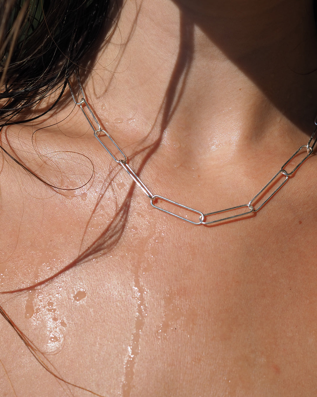 The ROMANIN WOOLAMAI NECKLACE features loose chain links crafted in eco-conscious recycled sterling silver with recycled 18k gold micron plating. Finished with a laser engraved branding plate and lobster clasp fastening. Inspired by the rounded geometric forms of the surf beaten rocks at Cape Woolamai, Victoria, Australia.