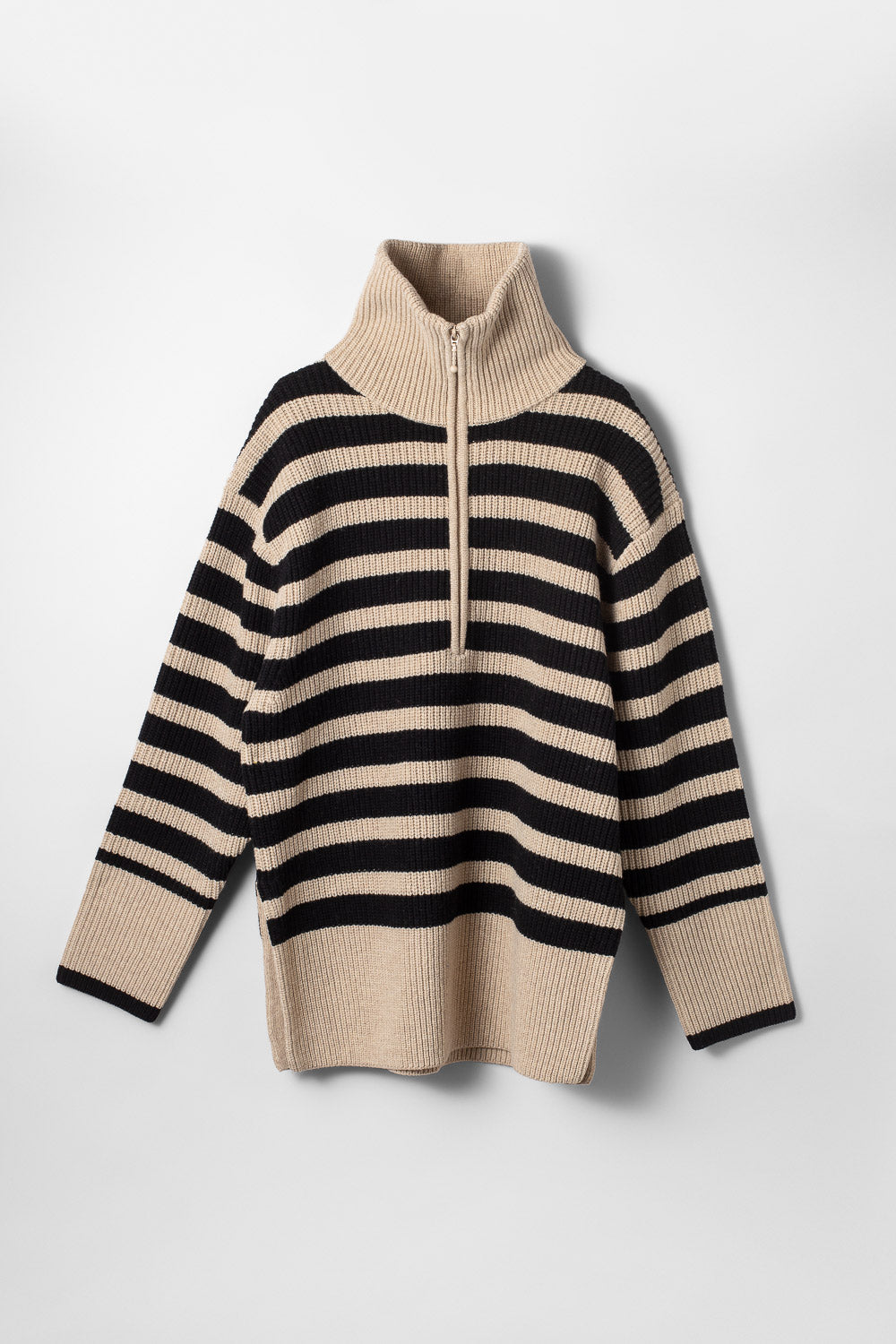 The FWSS Marine Fisherman Zip Up is an exquisitely cozy jumper knitted in an extra-fine merino wool rib-knit. Channeling the traditional marine jumper with a chunky zip-up turtleneck, horizontal stripes and slightly loose fit for easy layering. The flexible slits in both side seams provide high comfort aimed to fit any occasion or mood.