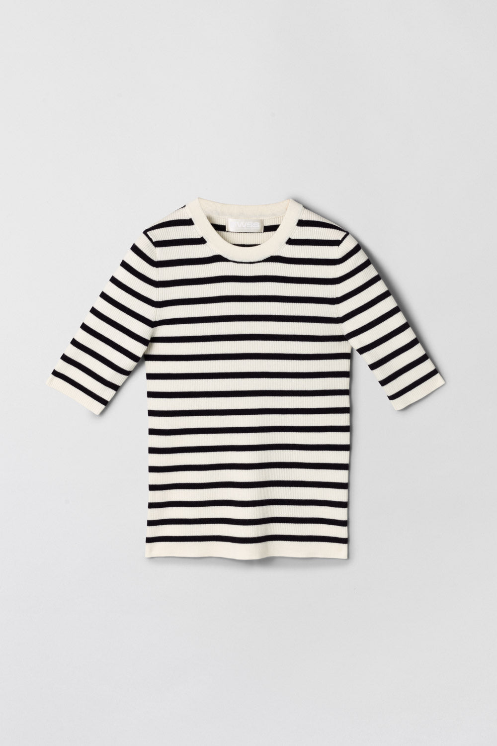 Midi Sleeve Rib Tee Cream Navy Stripe