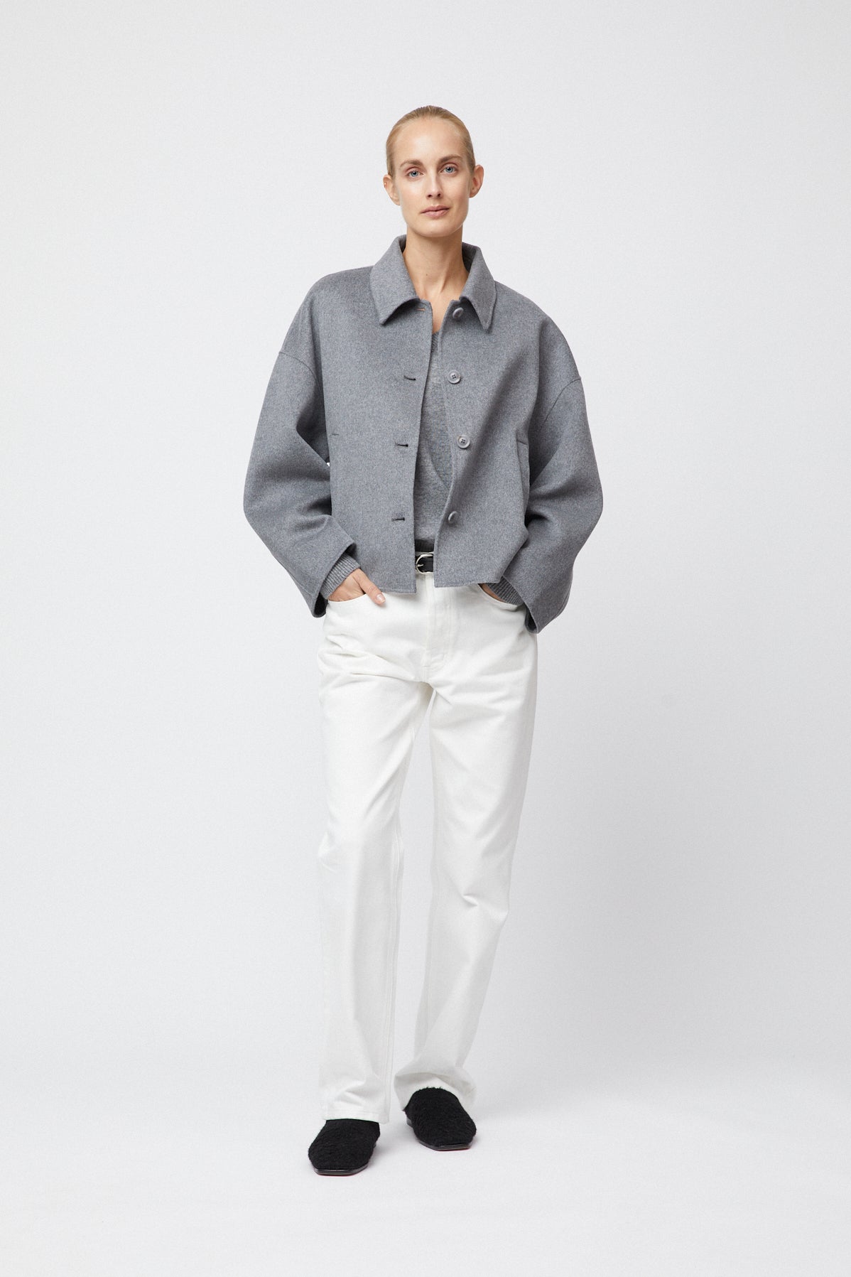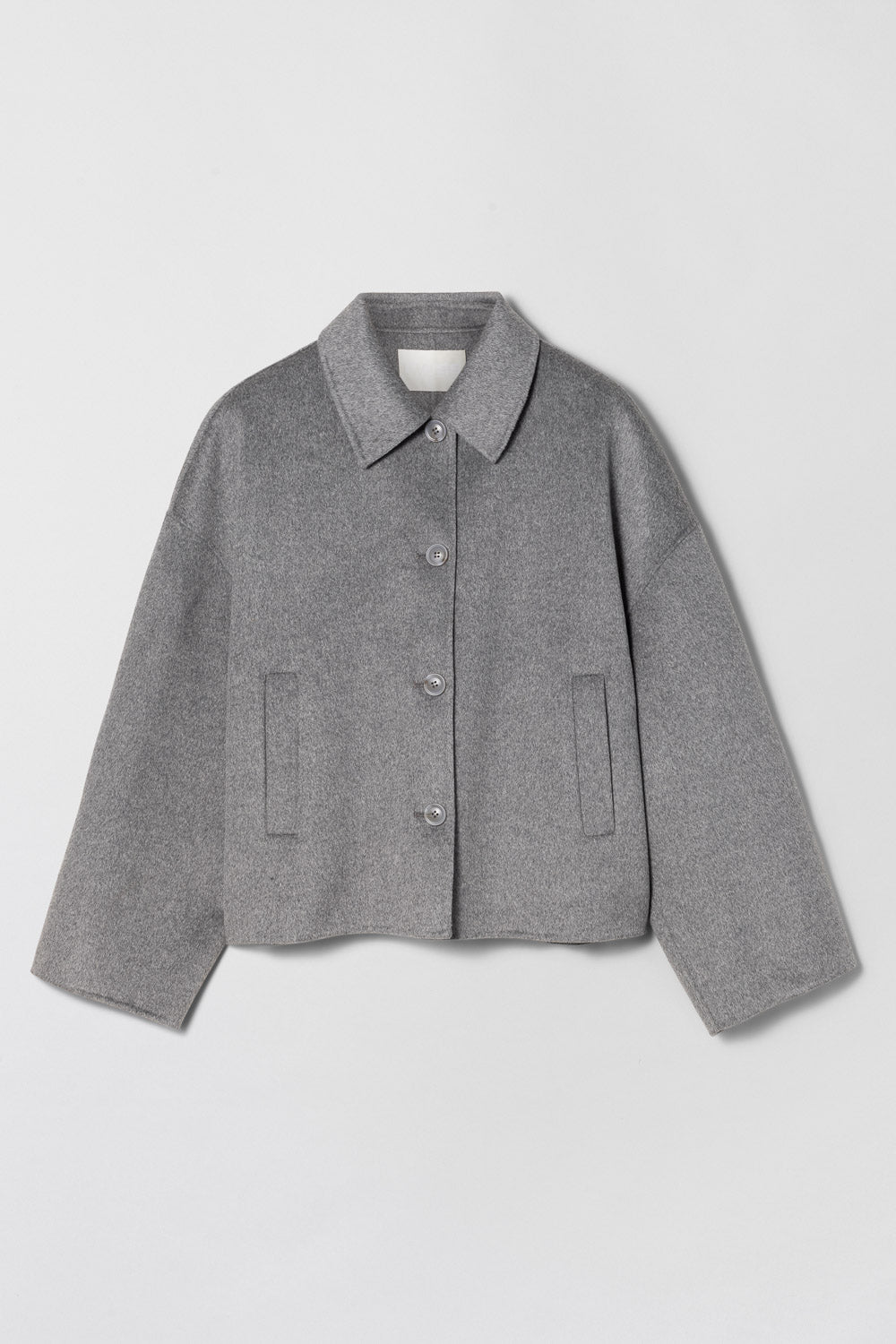 The FWSS Cropped Doublé Jacket is made from 100% doublé wool for warmth and comfort. It features a slightly cropped body, cocoon-shaped sleeves, a button-down front, and a classic collar, combining functionality with a clean design.