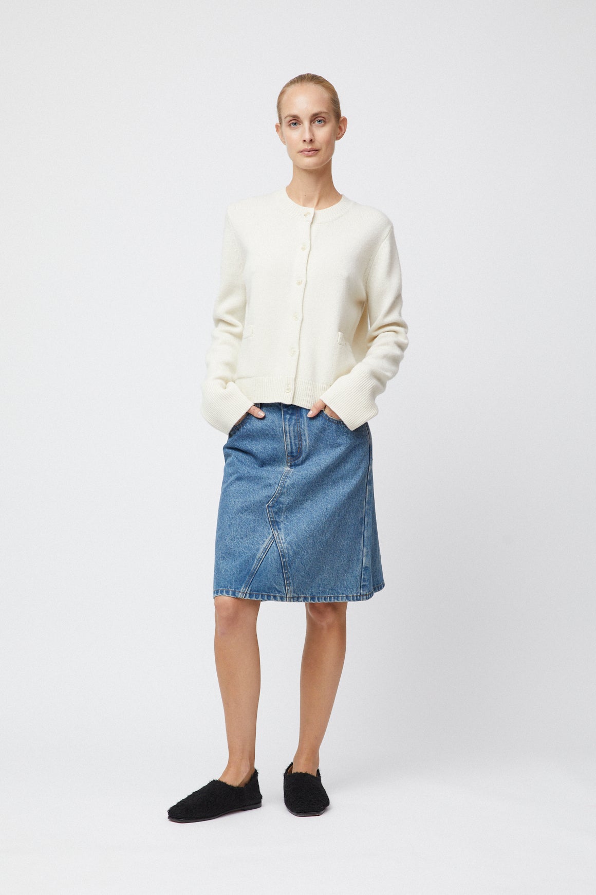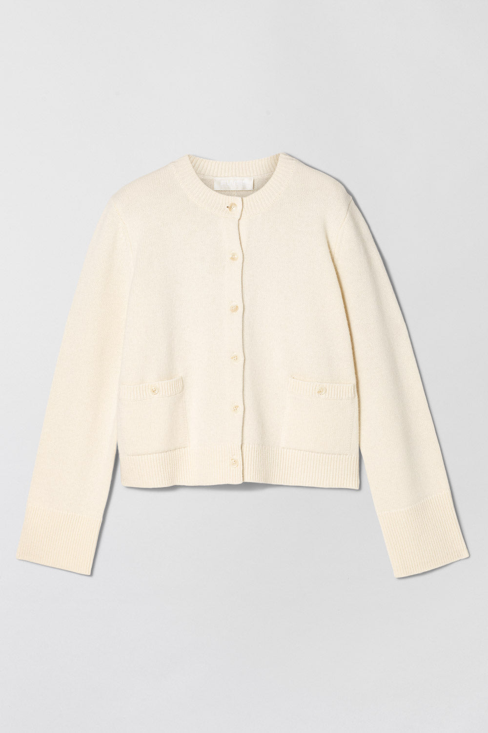 The FWSS Structured Wool Cardigan is made from 100% extrafine merino wool with a soft brushed finish. It features a relaxed fit with a feminine silhouette. The bell-shaped sleeves add volume, making it a versatile piece for everyday wear.