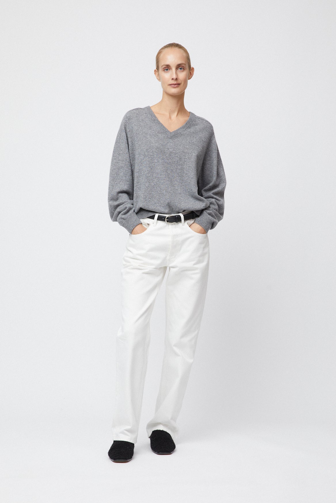 The FWSS Cashmere V-Neck Sweater is knitted in 100% soft cashmere. It has a relaxed, slightly oversized fit, with classic 90s details.