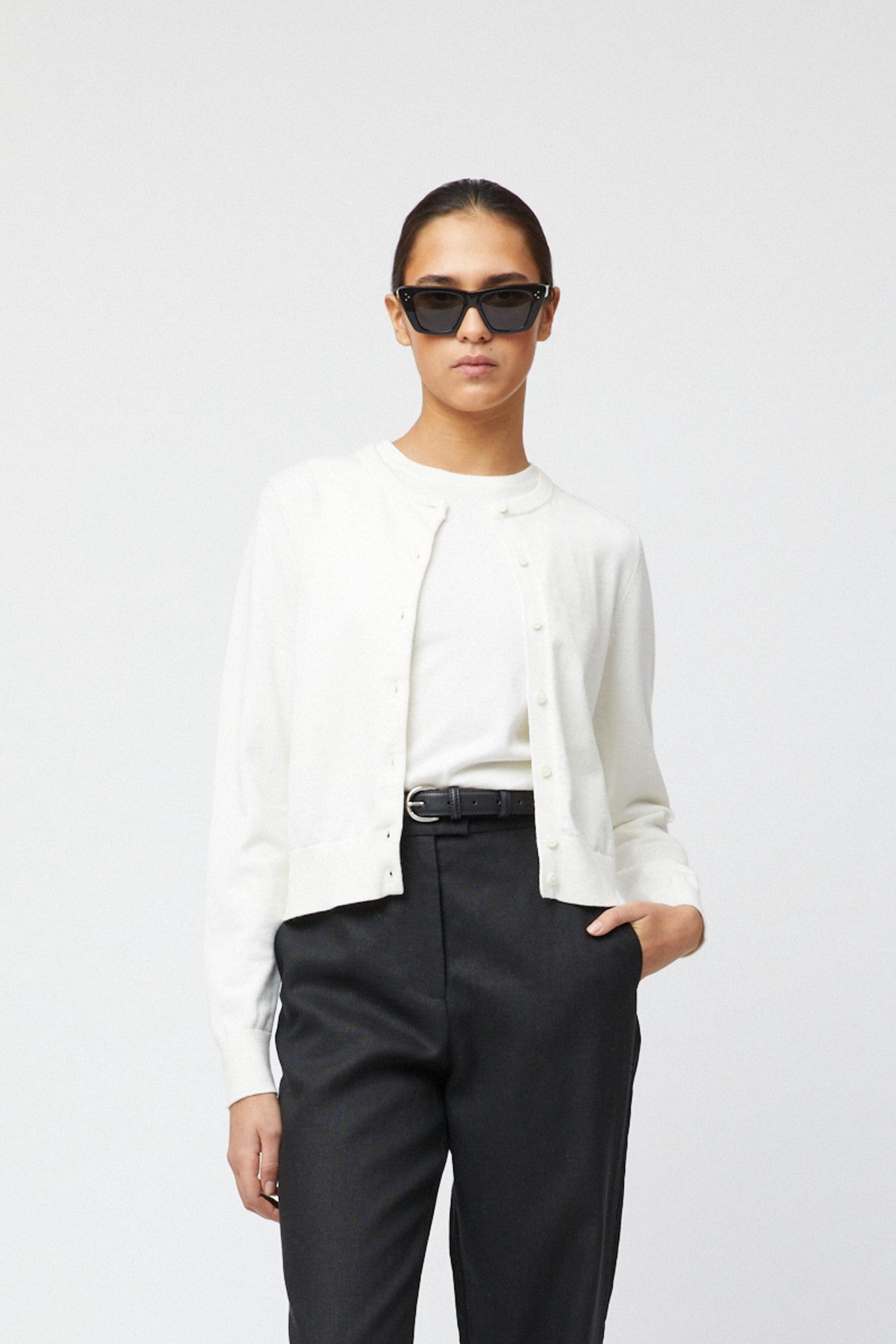 The FWSS Classic Cotton Cardigan is made from a soft cotton-silk blend that offers both comfort and a subtle, natural sheen. Designed with a slightly cropped fit that sits at the waist, it pairs beautifully with the Classic Cotton Tank for a clean, modern look.