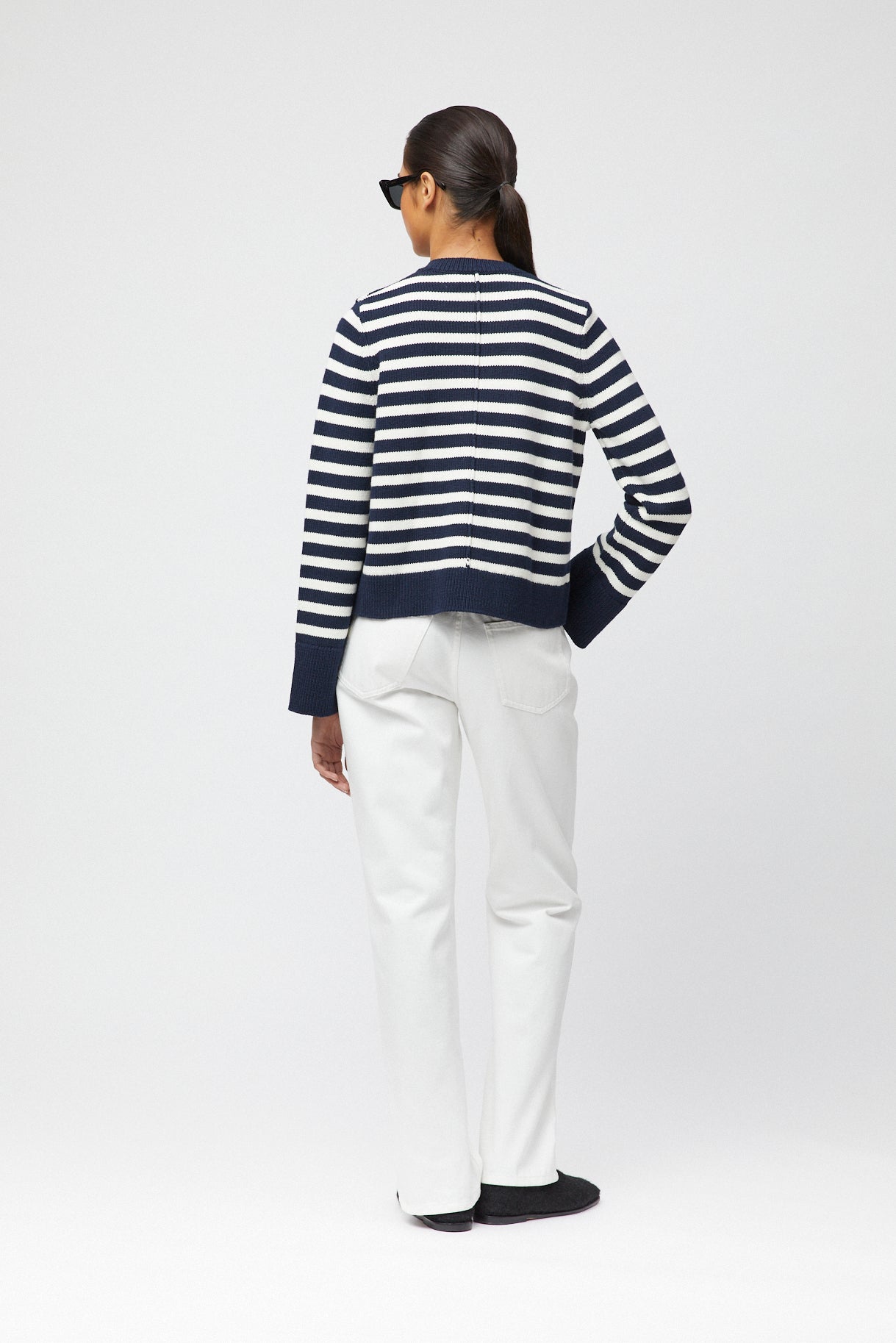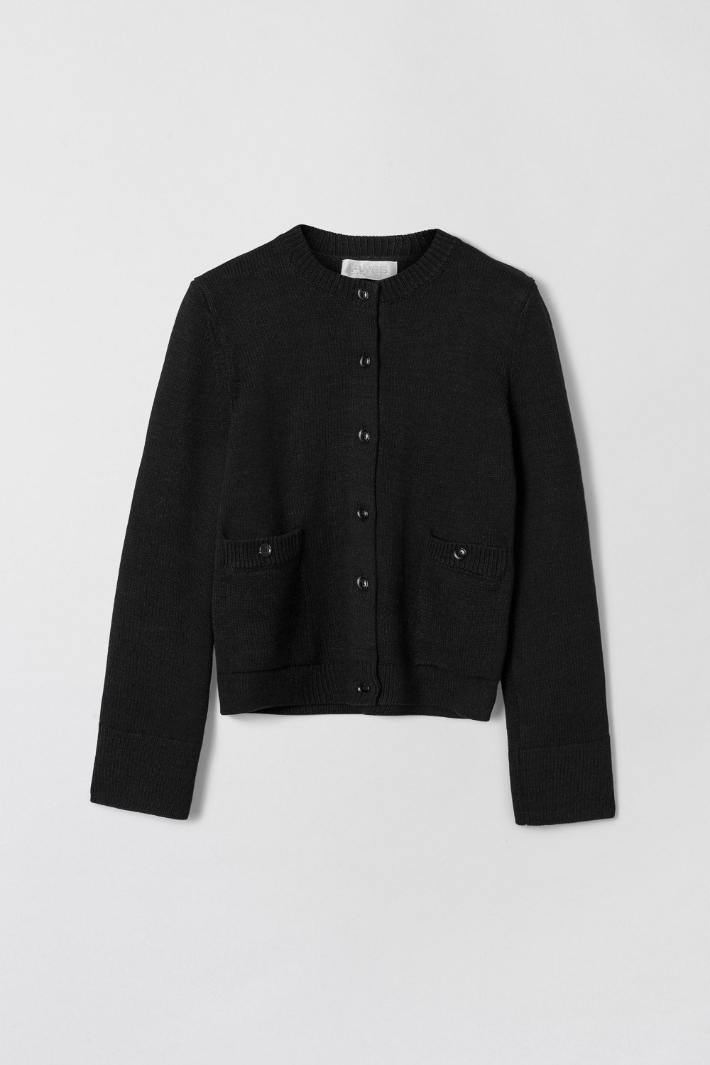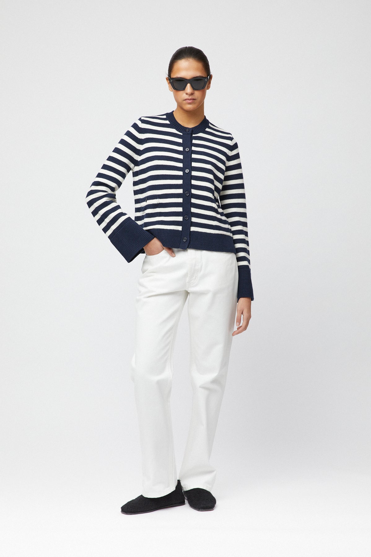 The FWSS Structured Cotton Cardigan is crafted for comfort and style. Made from 100% fine cotton, it offers a relaxed yet structured fit, with a feminine silhouette in a slight crop body. Features include a delicate buttoned closure and a subtle, small front pocket. The over-dimensional bell-shaped sleeves add a luxurious touch. Style with FWSS Linen Côte d'Azur Skirt and sandals for a refined look.