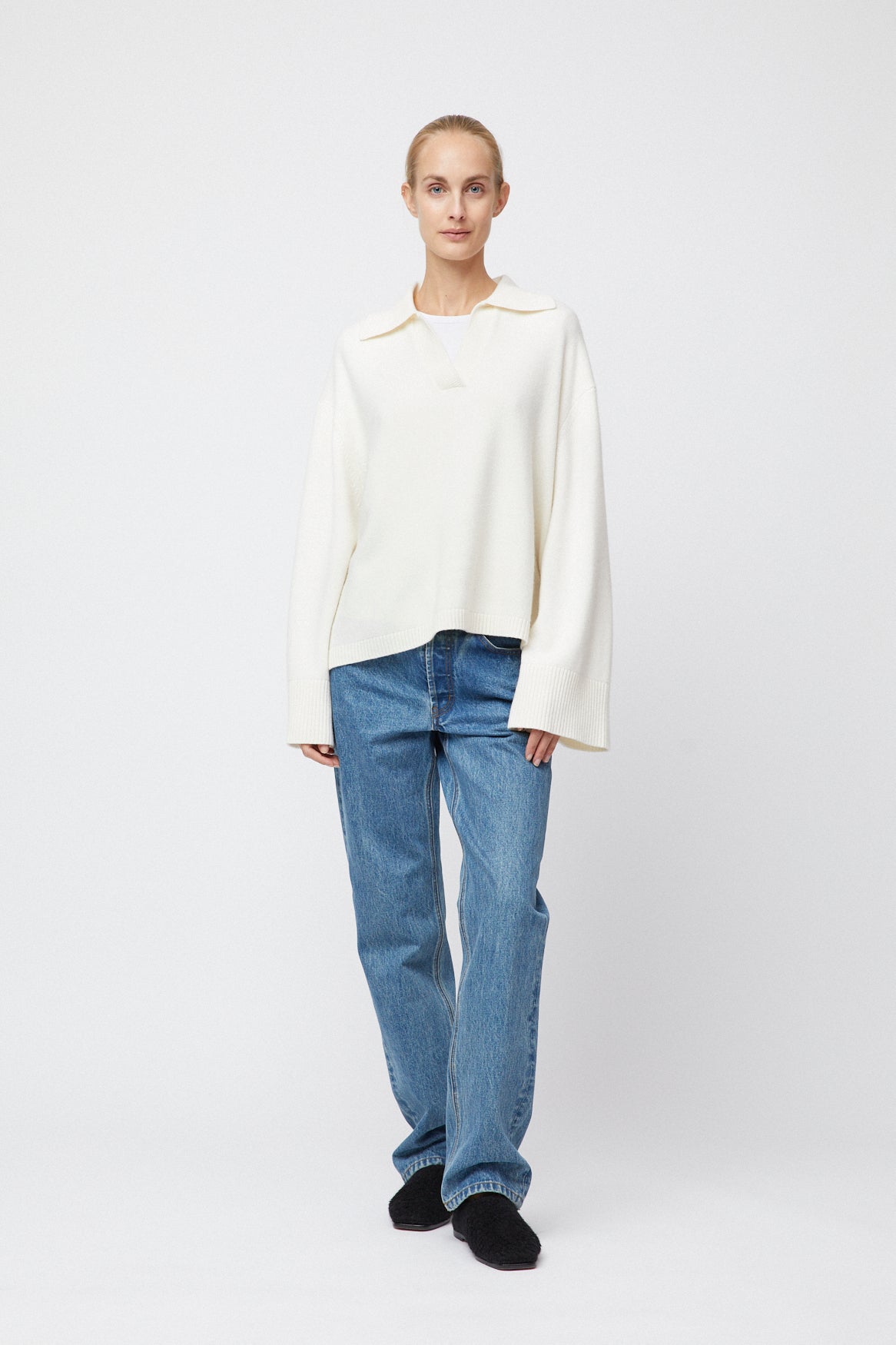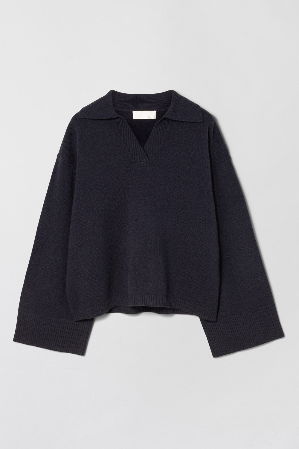 The FWSS Cape Cod Polo Sweater is knitted in super soft, ultrafine merino wool for a relaxed shape. Its plain knit construction, v-neck collar define the look, while wide sleeves and reversed jersey stitch detail offer a refined finish.