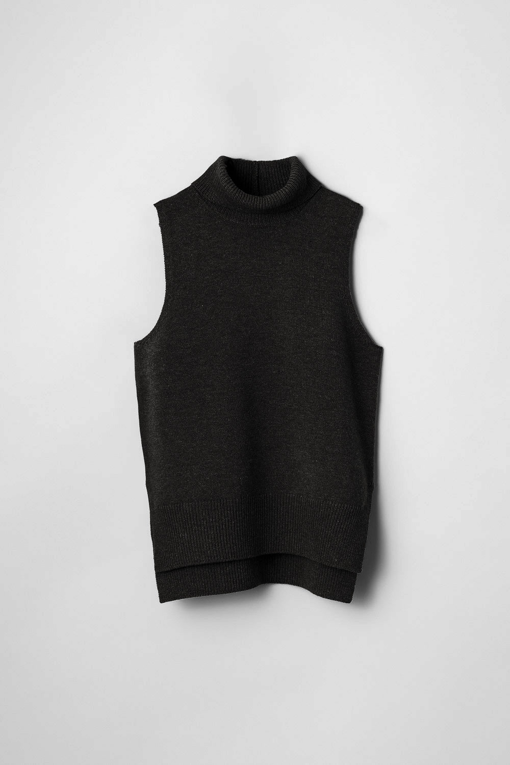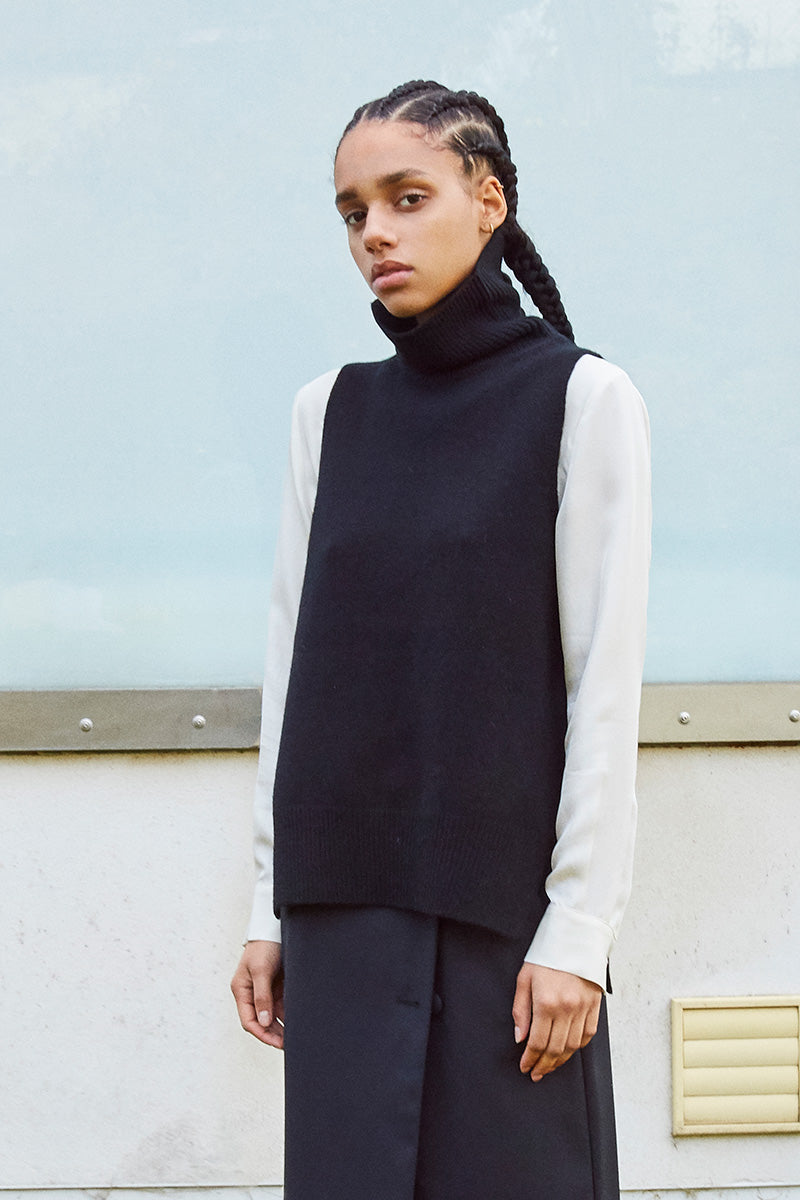 The FWSS Julie Vest is a turtleneck vest knitted from a soft 100% merino wool yarn. The style features pleasant details such as the slit opening at back of the high neck, subtle shoulder set-back, ribbed neck and hem with front hem slightly elevated. Slits in the side seams and relaxed fit.